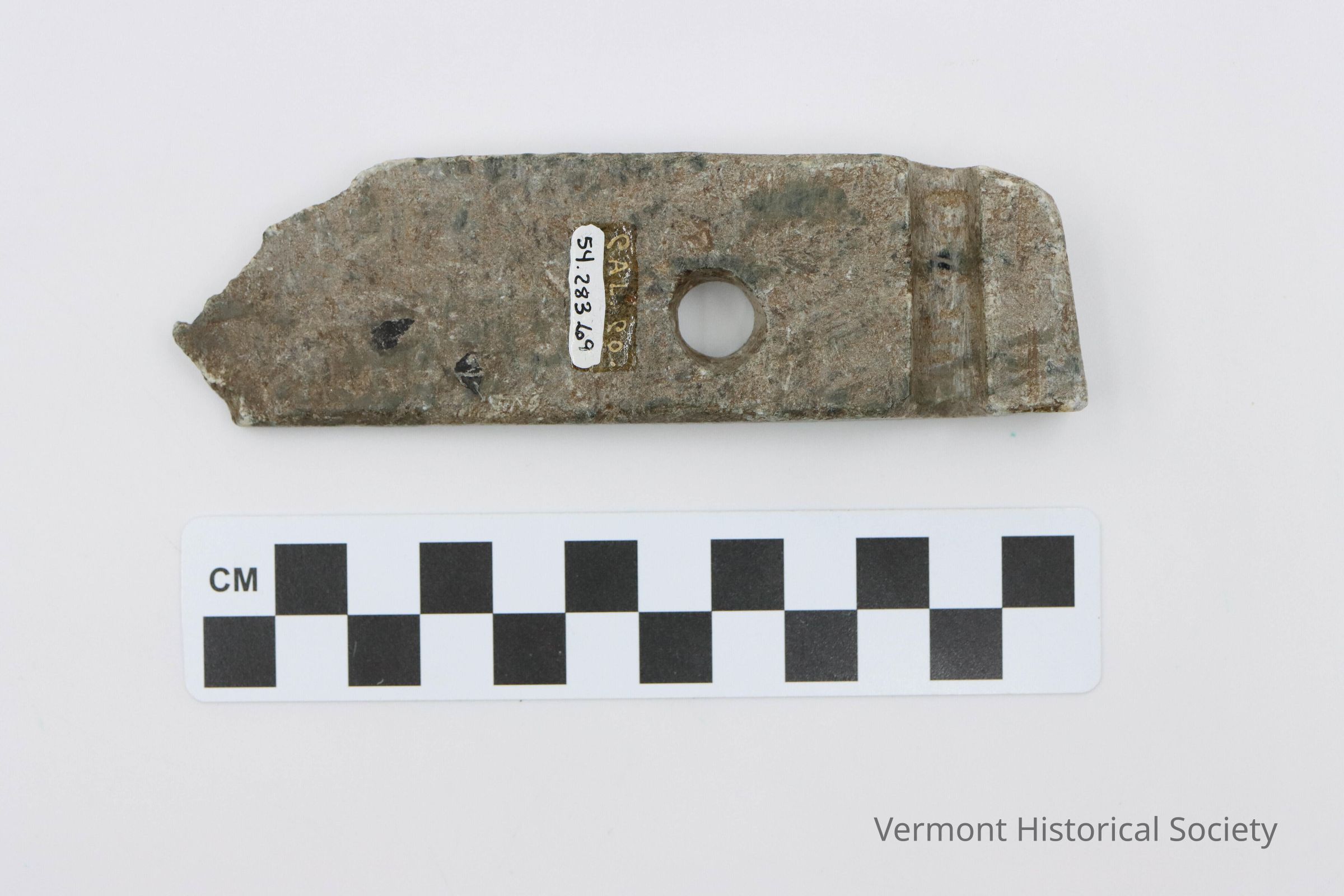 Ground stone shaft straightener. It is rectangular with one end roughly broken off. There is a round hole near the center, and a rounded groove running the width of the body.Use