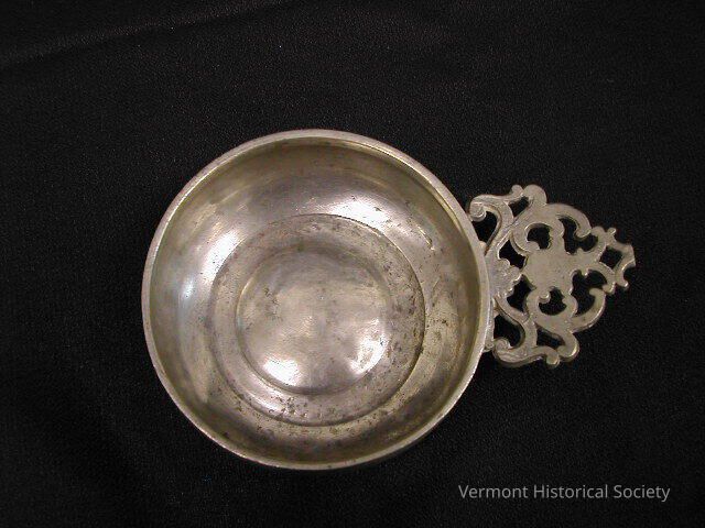 Pewter porringer with a pierced handle in a flat foliate design.