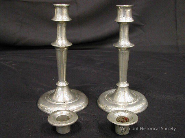 Pair of unmarked pewter candlesticks. There is a removable pewter bobeche at the top of each candlestick. The bases are round, and the shaft flares outward at two points.