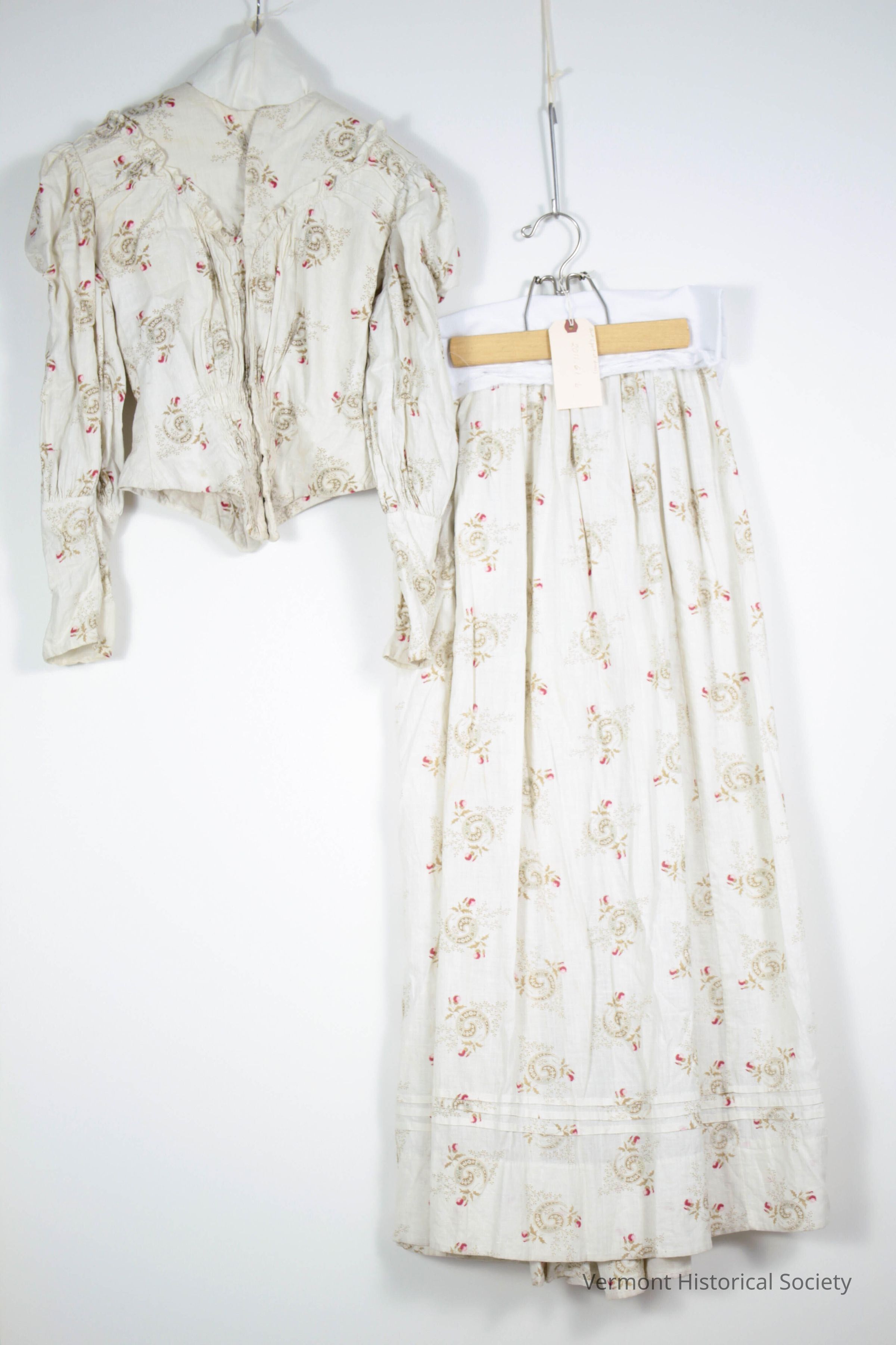 Two-piece dress consisting of a bodice and skirt. Both are made from lightweight white cotton printed with an abstract pattern of a paisley-type swirl surrounded by sprigs of small berries or flowers (visually similar to dill) and two rose buds. The bodice opens at the center front and secures with hooks and eyes. It has a small, pointed yolk at the top, and the shirt front attaches to the yolk with a raised ruffle. The bodice is shaped to the wearer through gathers at the center front. The sleeves have long cuffs and are puffed at the top. The full skirt is gathered to a waistband and decorated with three horizontal tucks near the hem.Context