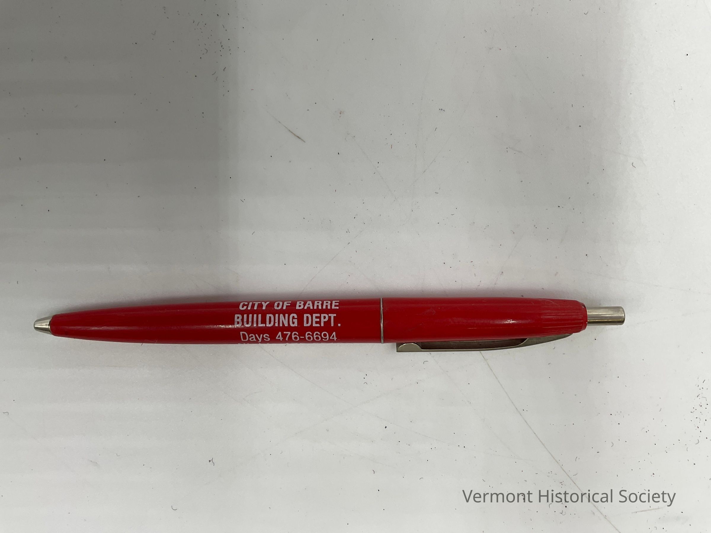 Red ballpoint pen with white printing that says, "City of Barre Building Dept. Days 476-6694, Nights 476-6513."Context