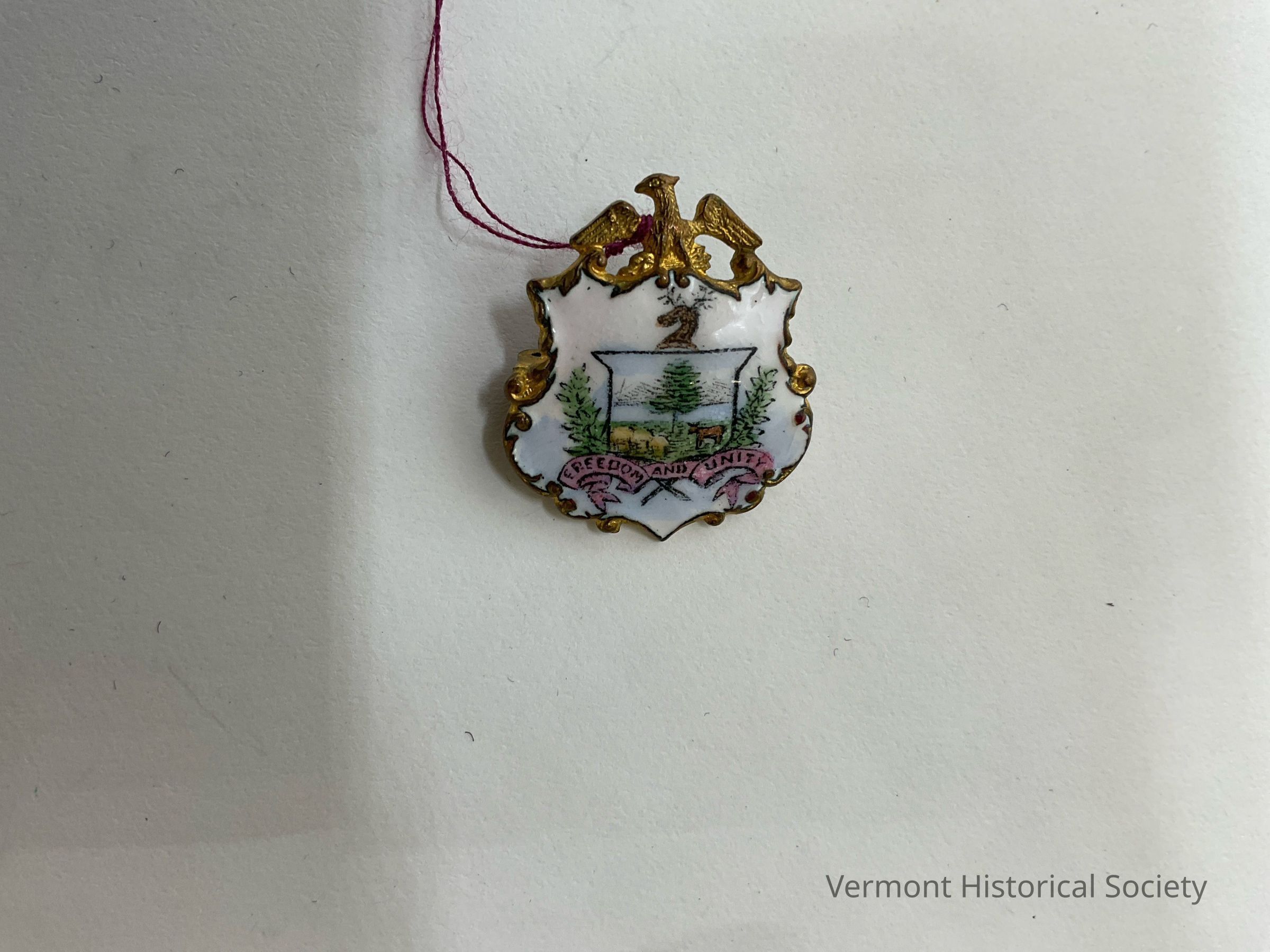 Small enameled post-backed pin with the Vermont coat of arms. The coat of arms is enameled within a shield shape, and the whole is topped with a gold-toned metal eagle.