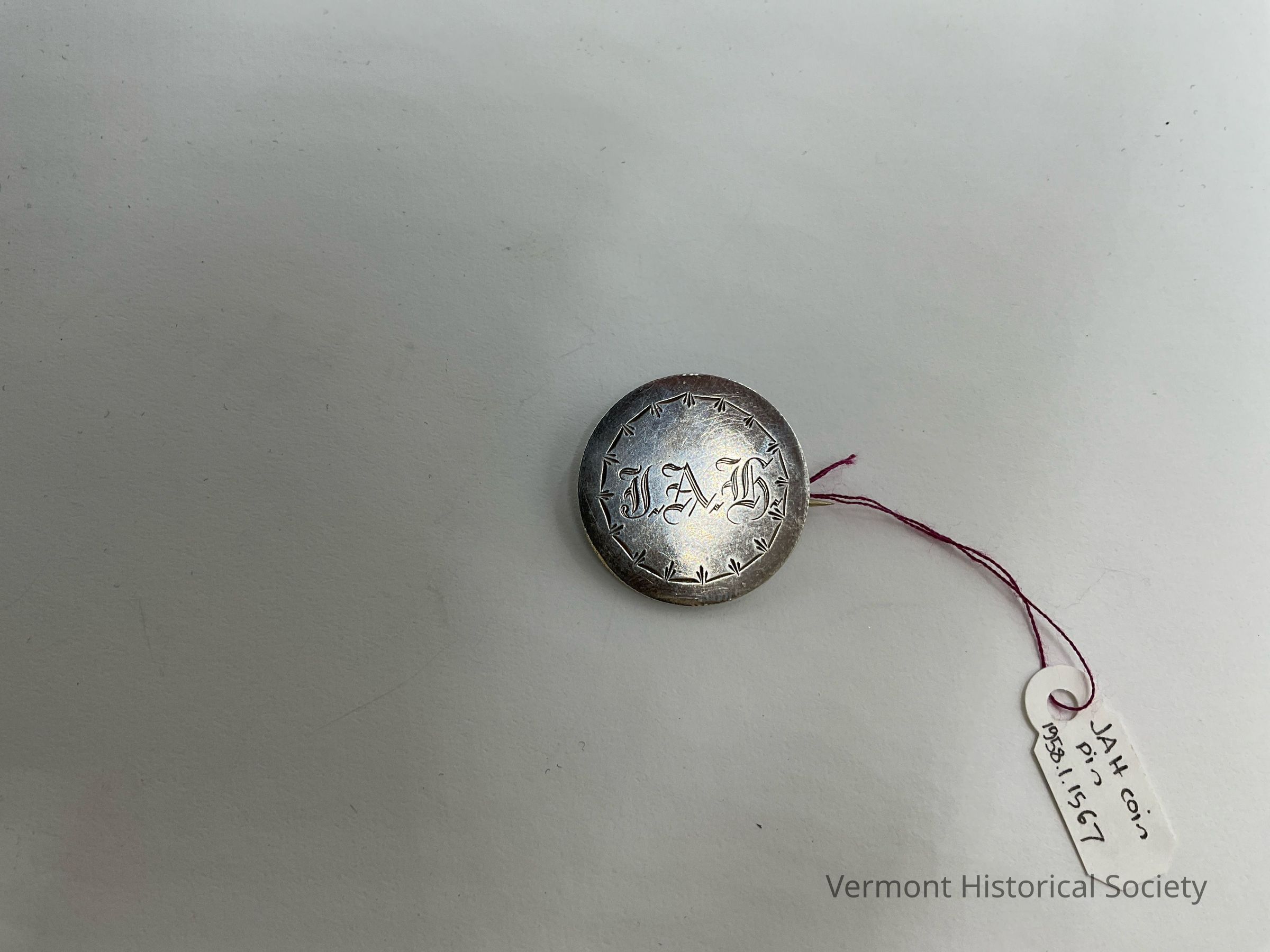 Round pin engraved with the monogram, "J.A.H." surrounded by a sprigged border. The pin is made from an 1854 seated Liberty quarter, visible on the back. The back has a hinged pin that is caught by a simple C-closure.