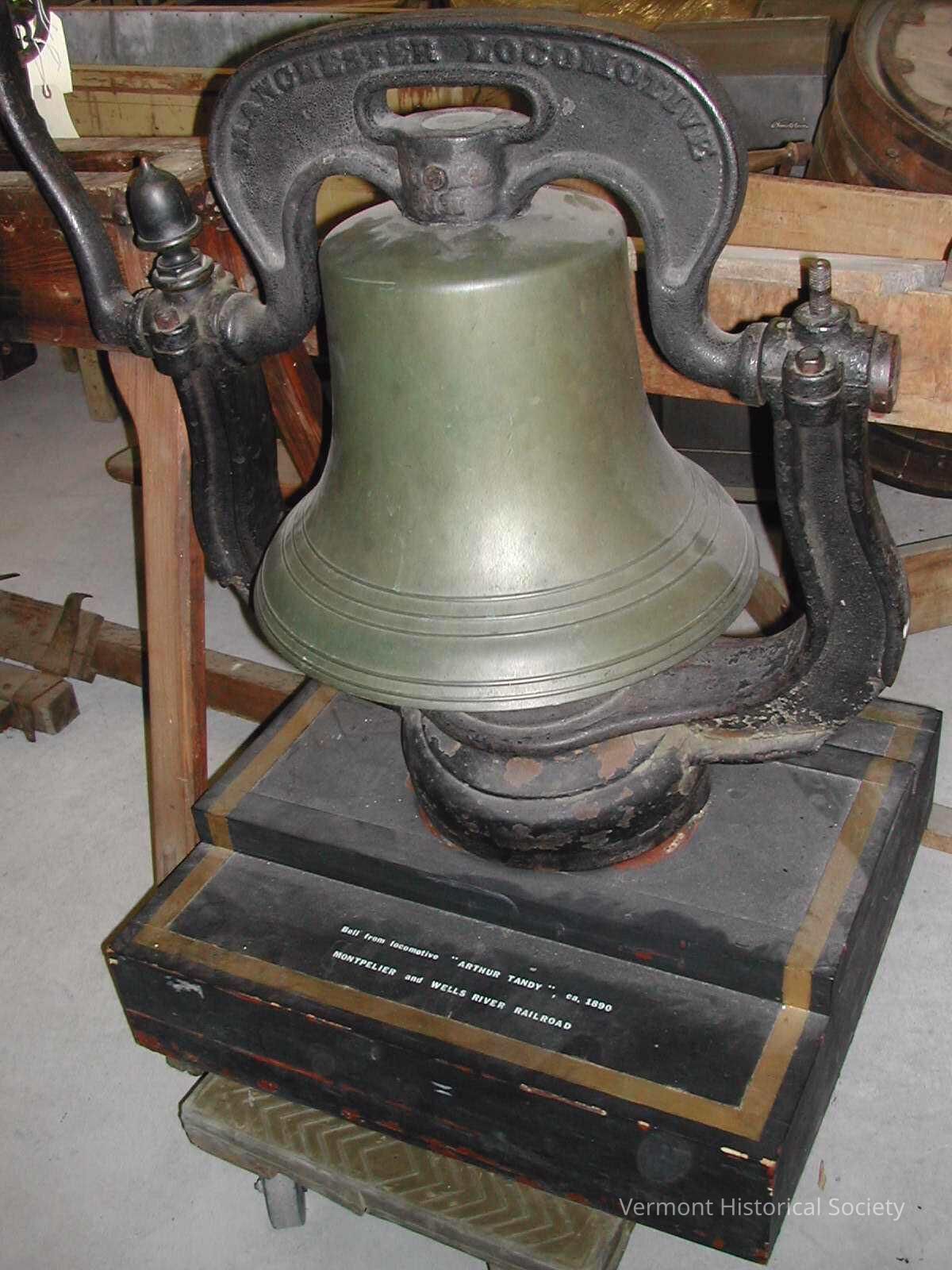 Large bell held in a cast iron frame. The upper portion of the frame sits in to vertical posts, allowing the bell to be swung by pulling the large handle on the left side. It is molded with the inscription, "Manchester Locomotive". The whole is attached to a square pedestal with the label, "Bell from locomotive "Arthur Tandy", ca. 1890 Montpelier and Wells River Railroad.