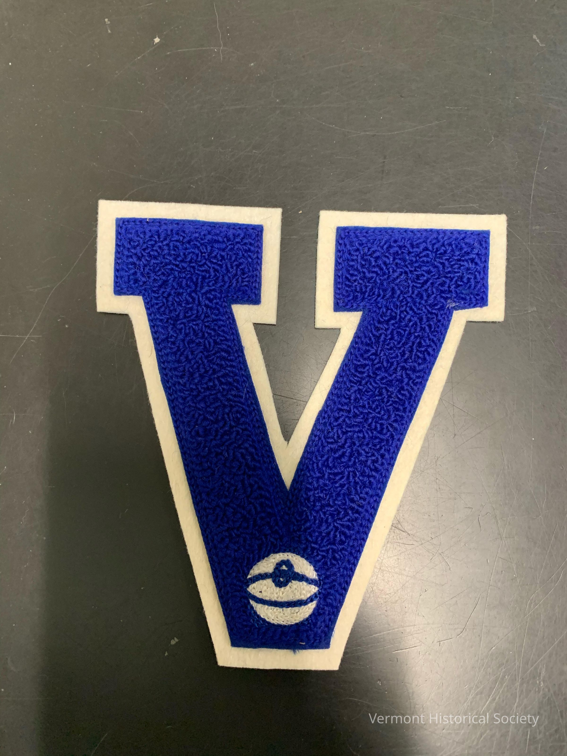 Varsity letter consisting of a blue, looped pile V over a white, felt border. A white basketball is embroidered at the bottom. The whole is mounted onto white buckram.