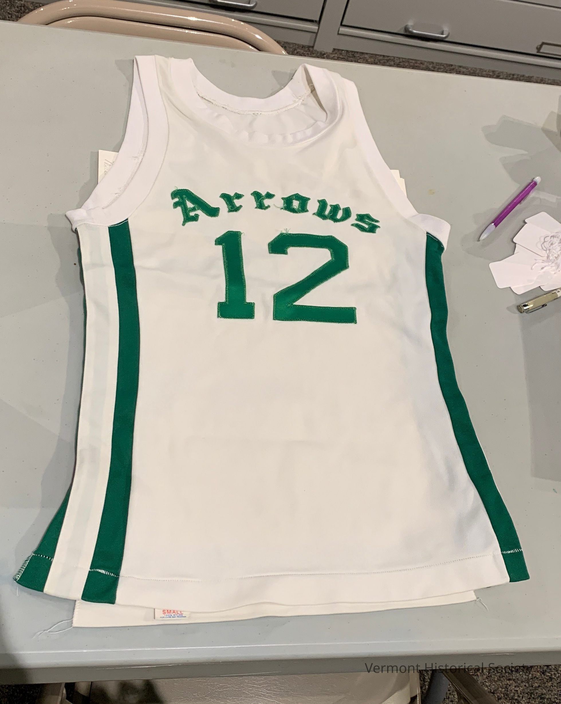 White and green sleeveless jersey with white background and green striping. In the center bearing inscription: "Arrows" in green fabric with green topstitching and the number "12" in same green fabric with green topstitching. Back has another "12" in same green fabric with green topstitching. Unlined interior with tag saying: "Champion (within logo blue, white and red) SMALL (in red) 100% NYLON FOR CARE SEE REVERSE (on Verso of tag) CHAMPION PRODUCTS INC ROCHESTER N.Y. MACHINE WASH TUMBLE DRY LOW TEMPS MILD DETERGENT AVOID CHLORINE BLEACH DO NOT IRON DESIGN RH 26094 MADE IN USA" all in light blue.
