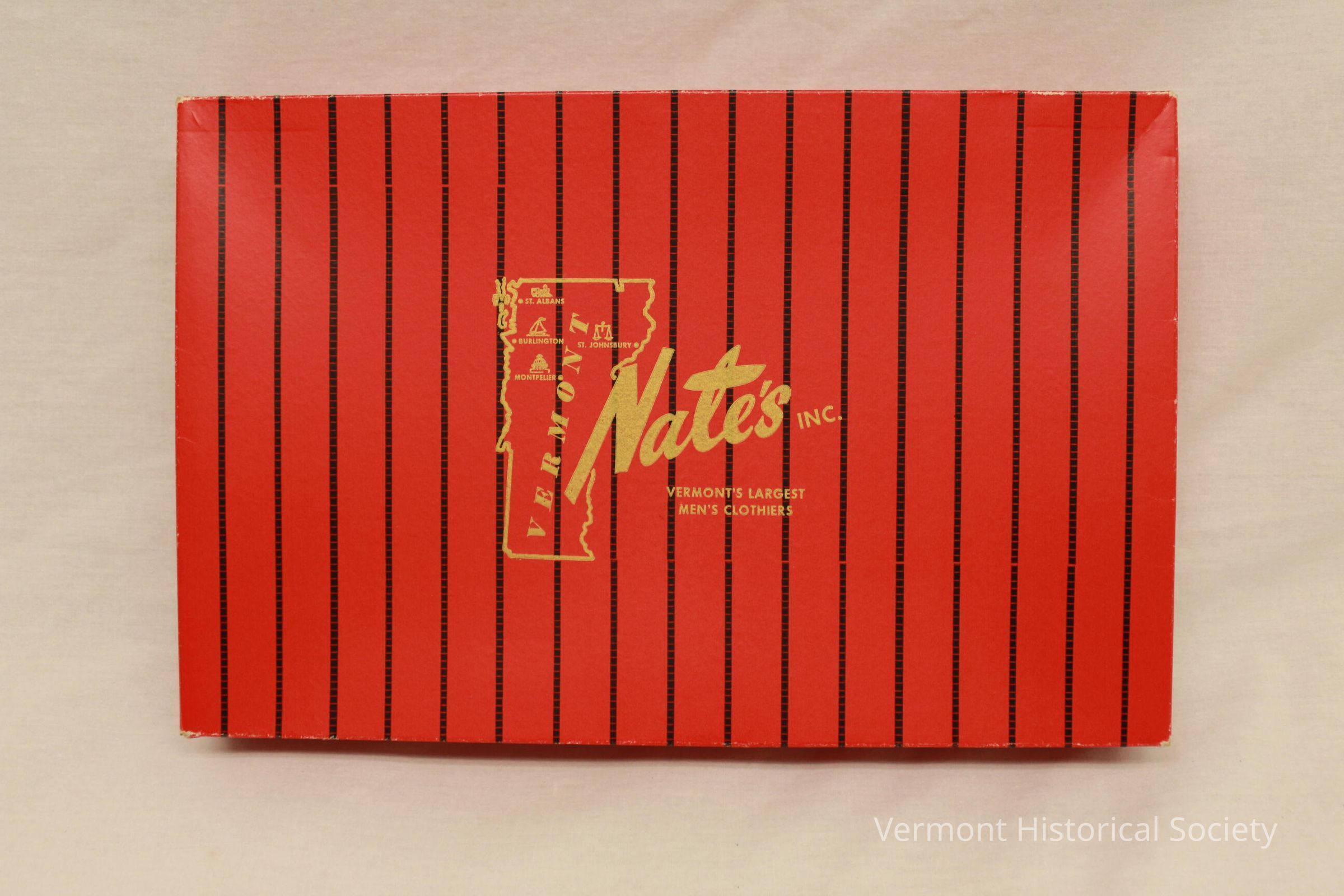 Two-piece clothing box consisting of a bottom (box) and top (lid). The exterior of both pieces are red with narrow black stripes. They are printed in the center in gold with a map of Vermont and the inscription, "Nate's INC. VERMONT'S LARGEST MEN'S CLOTHIERS". The interiors of both pieces are printed with a marbled pattern in gold and white.Acquisition