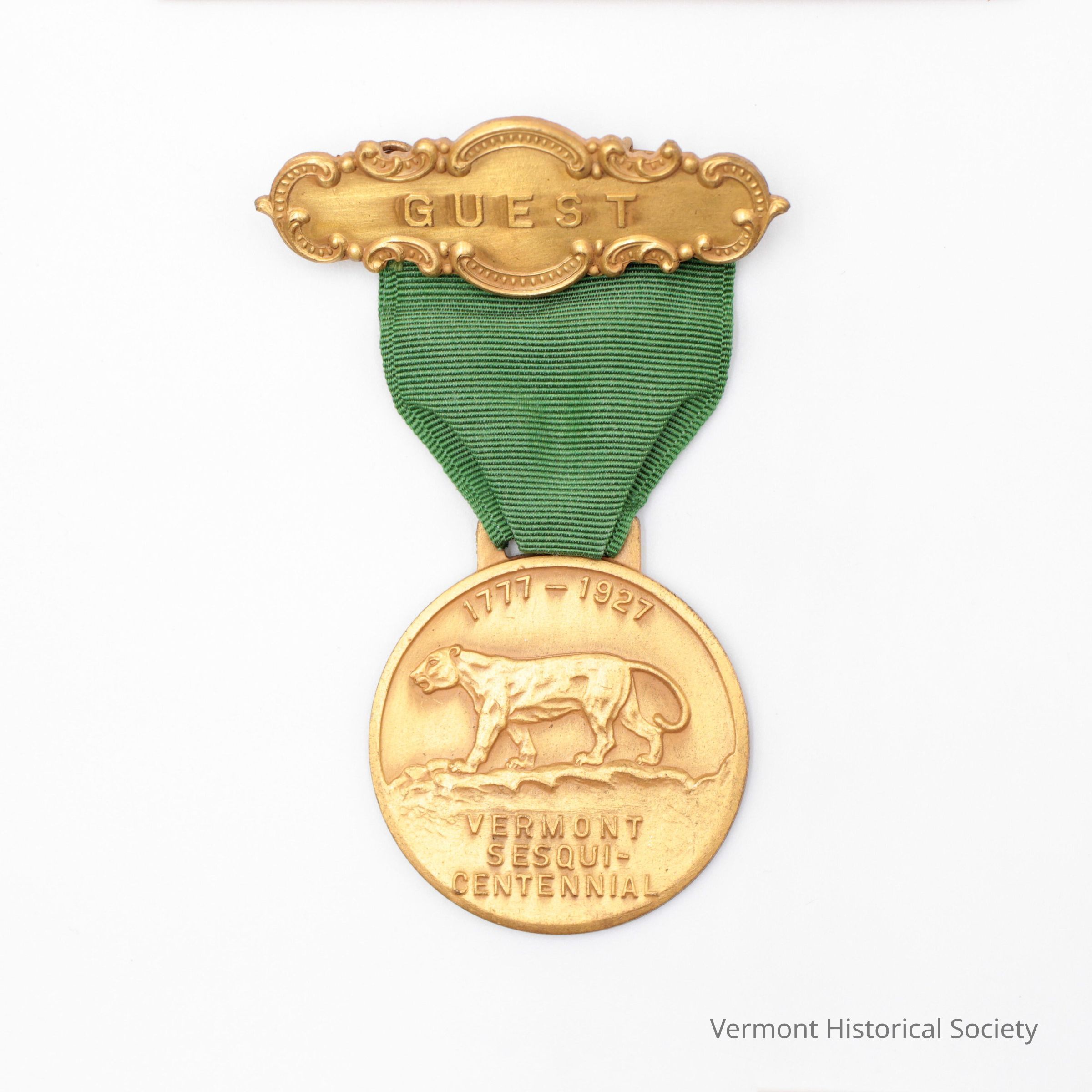 Membership ribbon consisting of a bar, ribbon, and medallion. The bar has a decorative scrollwork border and the word, "GUEST". The green, grosgrain ribbon hangs from the back of the bar and is gathered and turned back at the bottom. From the ribbon hangs a round, gold medallion molded with an image of a walking catamount with the inscription, "1777-1927 VERMONT SESQUI-CENTENNIAL". The back of the medallion is molded with a large building with a hipped room and a wooden fence. There is a sign in the shape of a catamount near the door. The back has the inscription, "CATAMOUNT TAVERN TO COMMEMORATE THE BATTLE OF BENNINGTON AUG. 15, 1777".