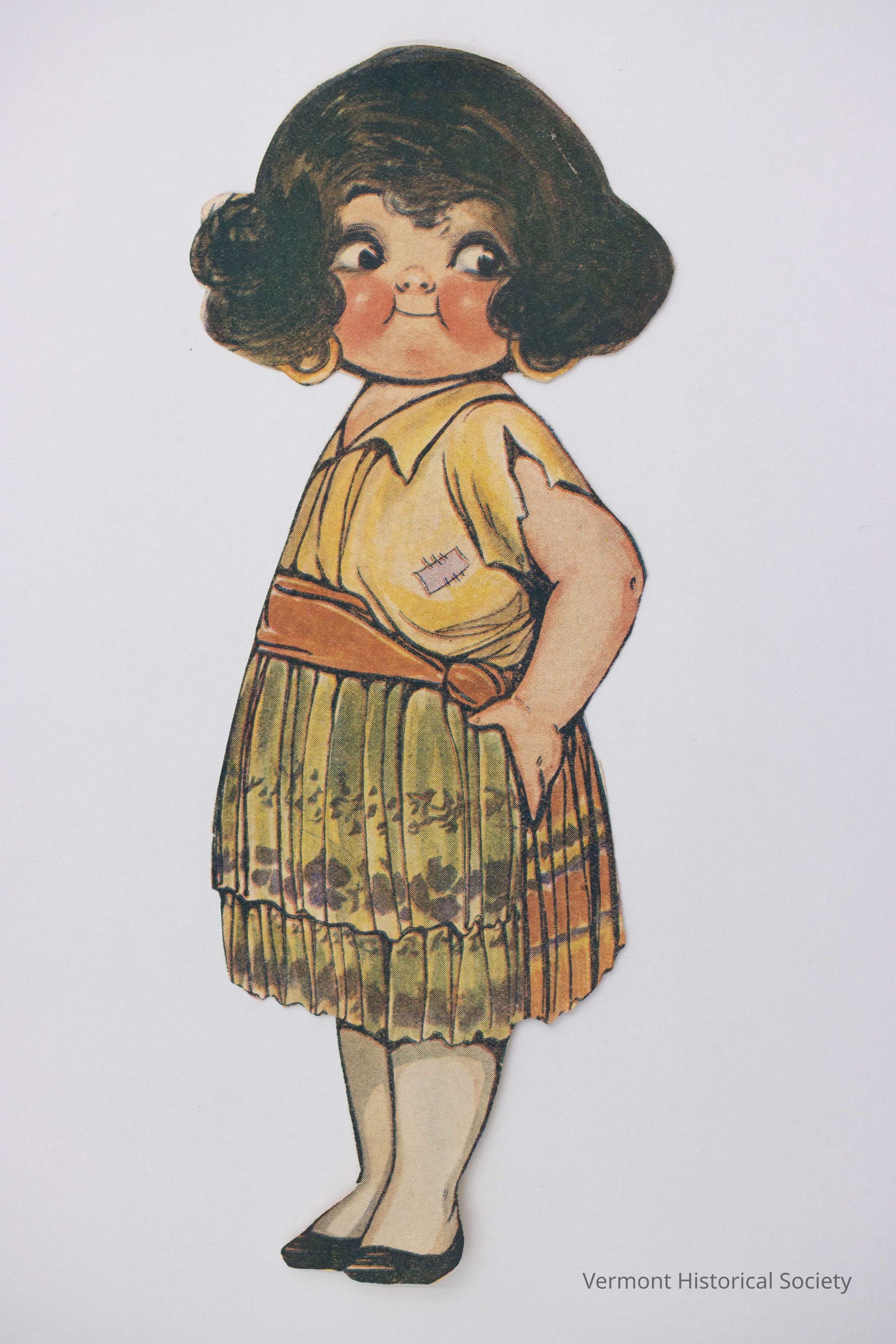 Paper doll. The doll depicts a young child with black hair and pink skin wearing a yellow shirt, orange skirt, green apron, and large gold hoop earrings. The back shows a portion of a sales catalog page.Context