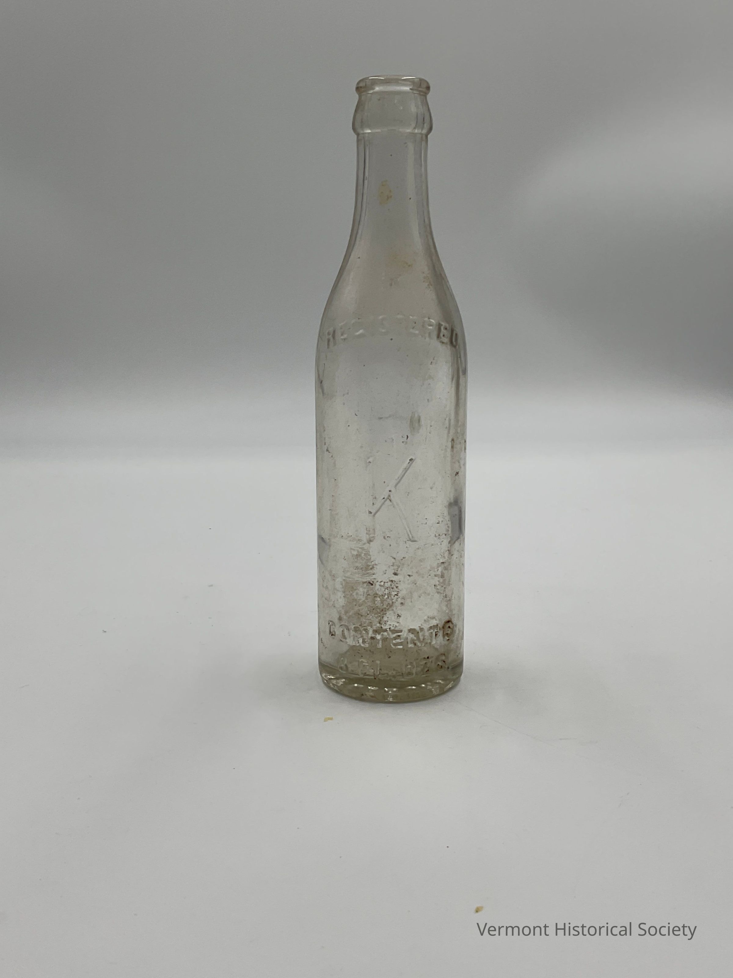 Colorless glass bottle. The bottle has no decoration. The words "REGISTERED / CONTENTS 8 FL. OZS." with a large letter "K" in the center are impressed on the body of the bottle. The opposite side of the letter "K" features "4285 / ROOT / 27" impressed in small print. The base of the bottle has the words "MIDDLEBURY / VT." stamped on the glass.