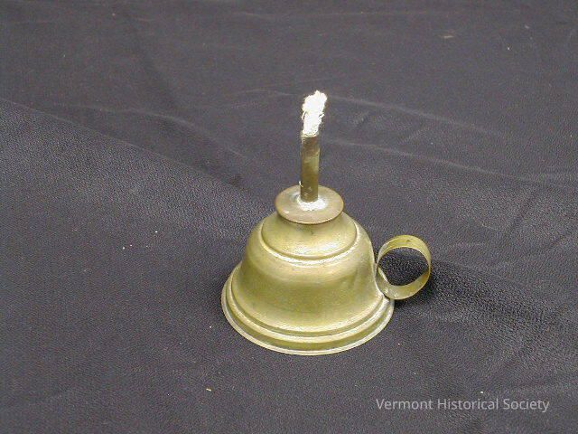 Oil lamp shaped like a bell with a loop handle at the side and a wick holder in the center.