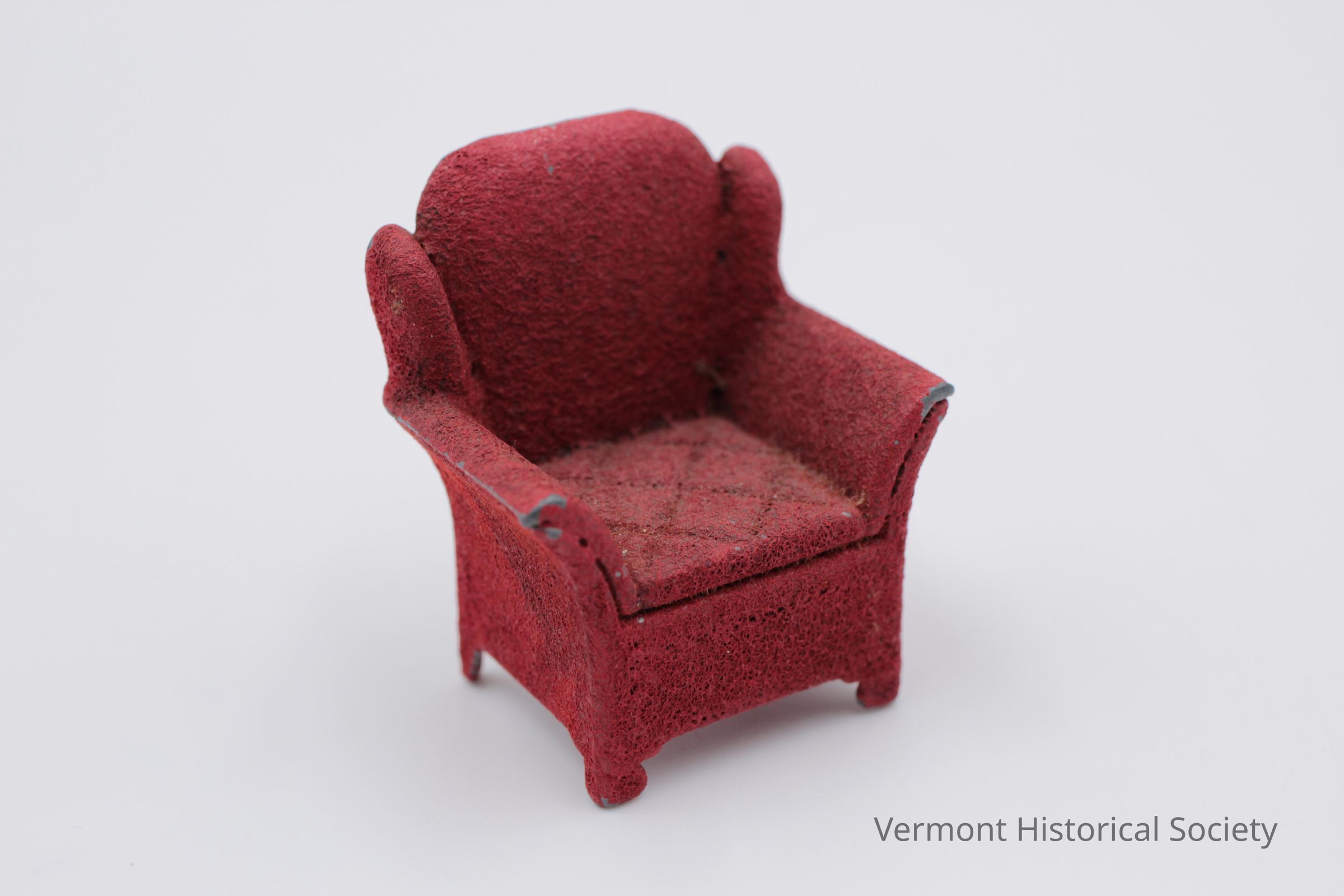 Miniature armchair sized for a dollhouse. The chair is made of cast iron and flocked with red fibers. It is molded to look cushioned.Context