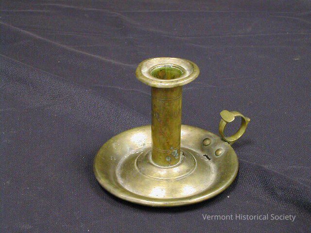 Small brass candlestick with finger handle. The candlestick is set into a wide drip guard.