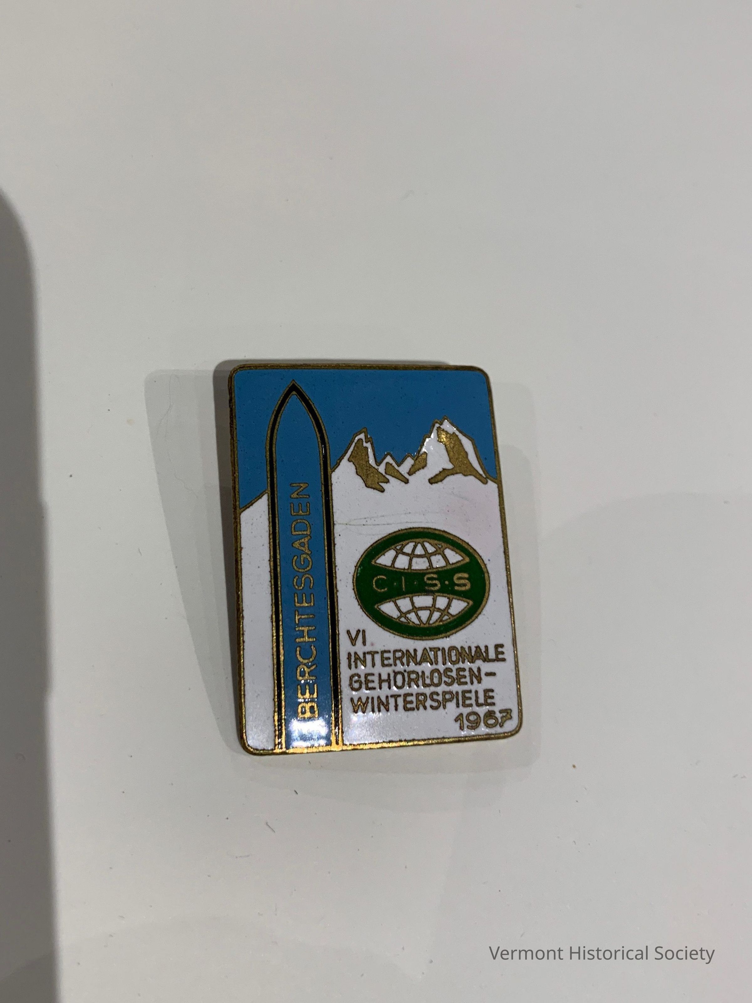 Presented to Herbert P. Holbrook who was a class A ski jumper and olympic cross-country skier on the occasion of the 6th annual World Winter Games for the Deaf "Deaflympics" which was held in Berchtesgaden (West Germany). Holbrook won fifth place in cross-country skiing and therefore this pin. He was an alumnus of the Austine School for the Deaf, and admitted to the AAAD (American Athletic Association for the Deaf) in 1964, when he also made the New York Times News twice that year. He competed in Berchtesgaden (West Germany) in the 60's and in the Meribel Olympics in France in 1979.Acquisition