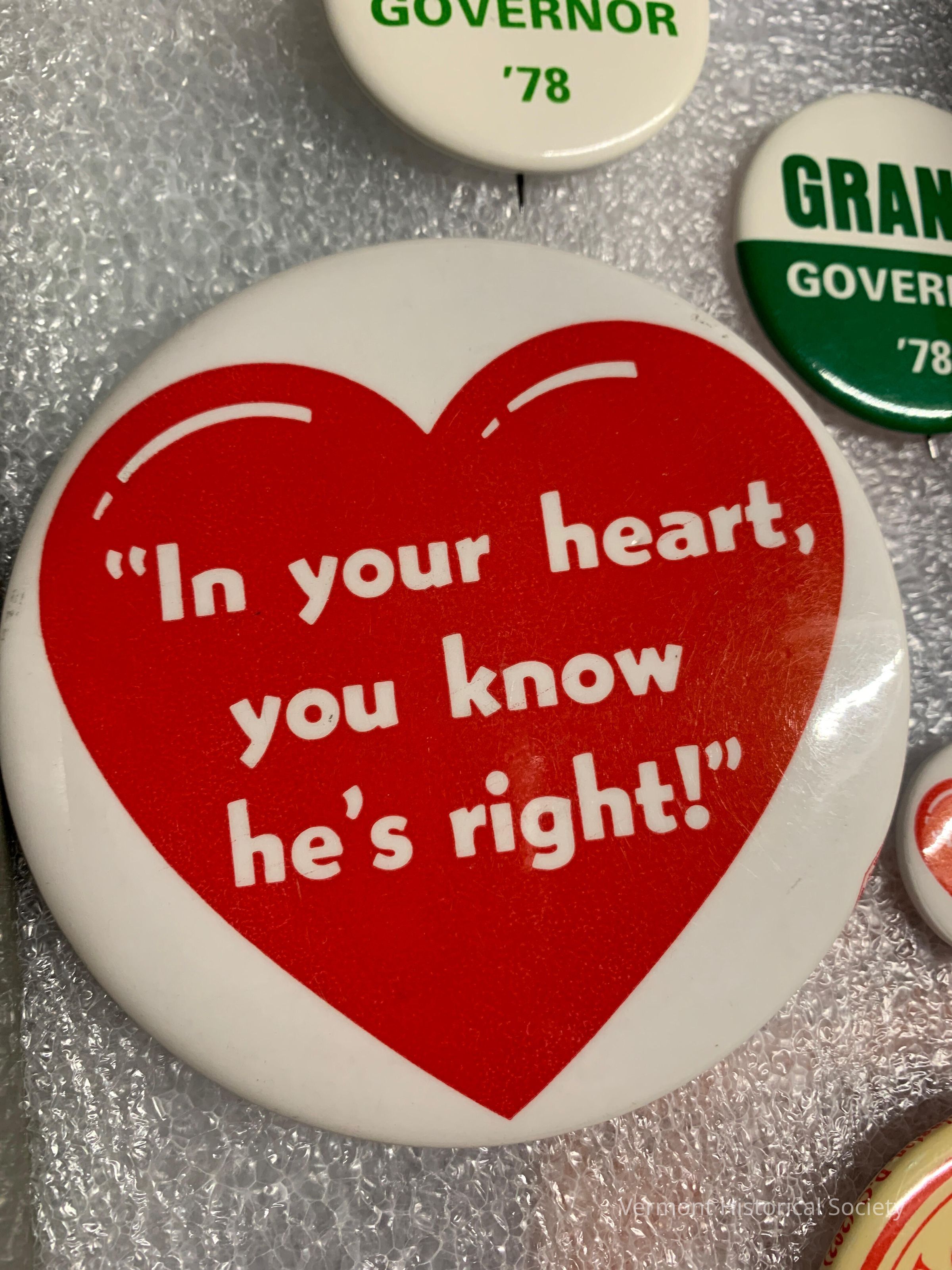 Two political pins, identical except for their size. Each has a white background and a large red heart in which is written, "In your heart, you know he's right!"