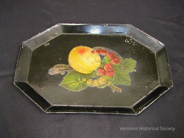 Black toleware tray with detailed painting of a peach, grapes, and leaves in the center. The rim of the tray flares upward and forms eight straight sides. The back is scratched with the inscription, "Irene Rice Woodstock / Oct. 10, 1819 / May the love of God be with you, through this World and the next" in cursive.Context