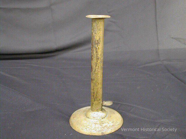 Gold-painted straight tin candlestick with a round base. There is a tab on the side for raising the candle.