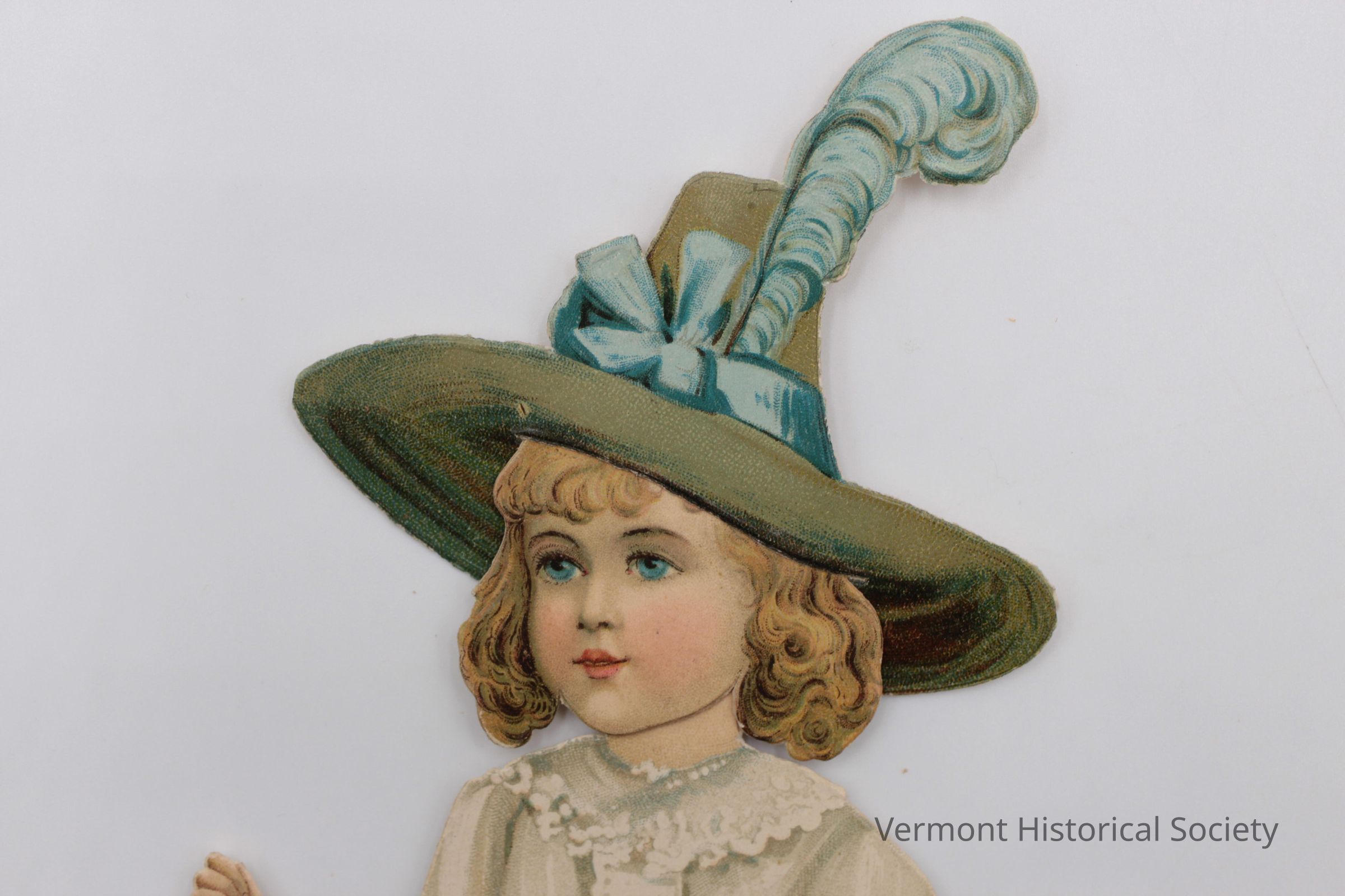 Green, wide-brimmed hat for a paper doll. The hat has a tall crown and is decorated with and blue ribbon and feather.Context