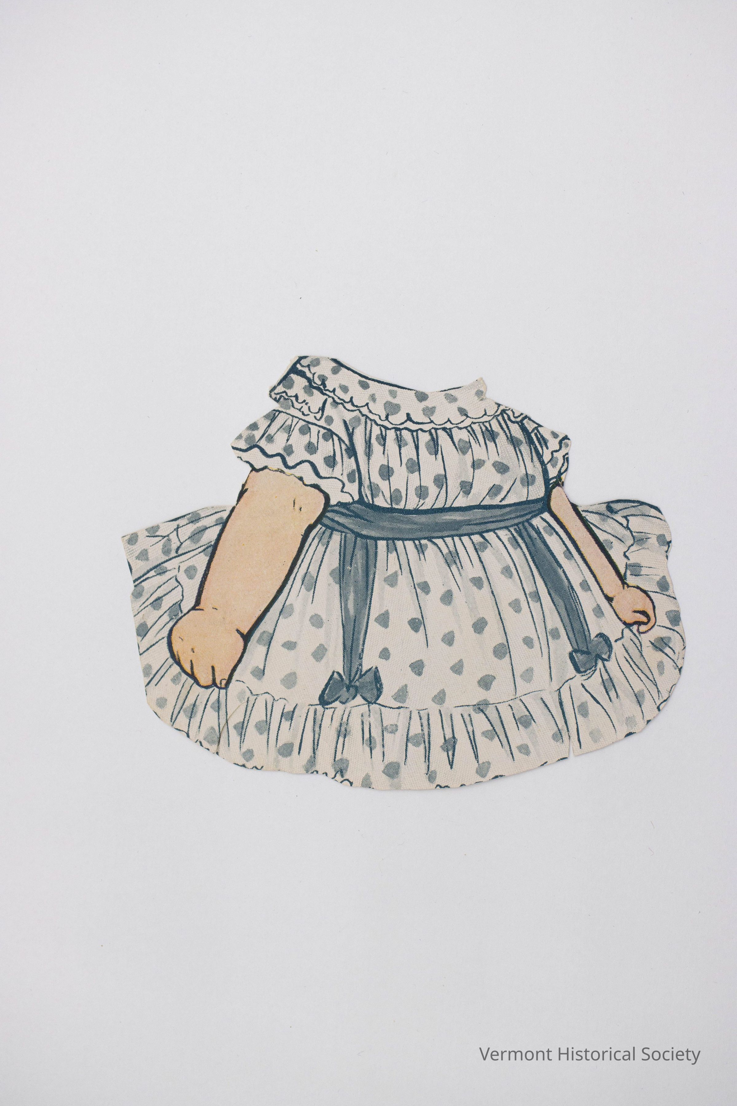 Printed paper dress for a paper doll. The dress is white with blue dots. The back shows a portion of a magazine article.Context