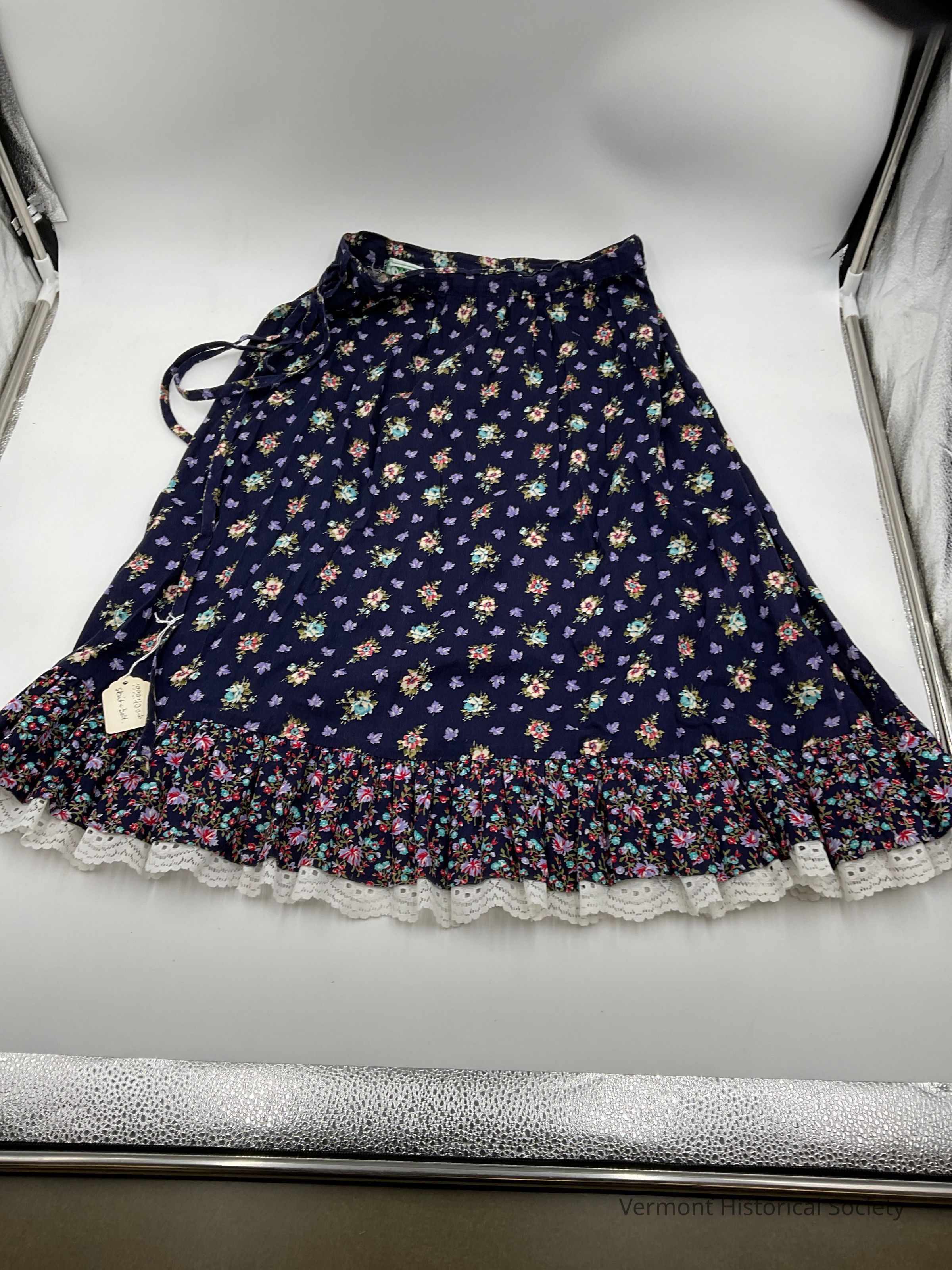 Skirt with matching belt. Purchased by donor at the Vogue Shop in Montpelier, Feb. 1981 for her Father's funeral.Context