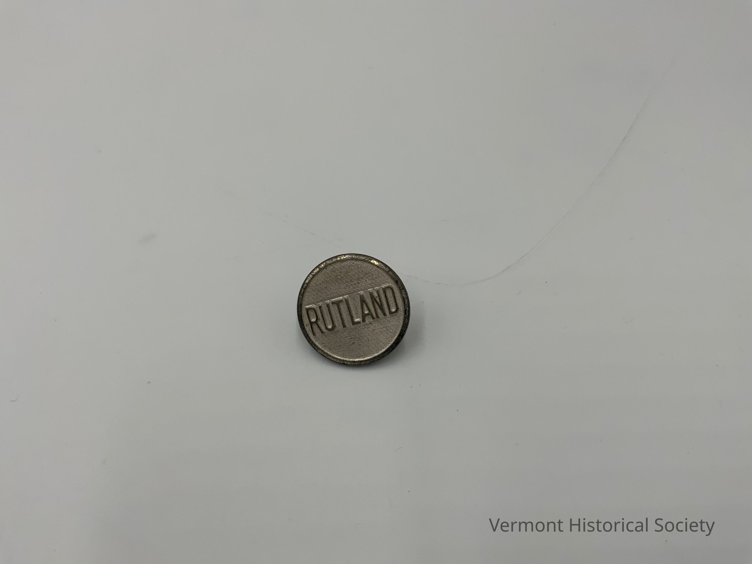 Silver-toned post-backed button with the molded inscription, "RUTLAND" on a striped textured ground.