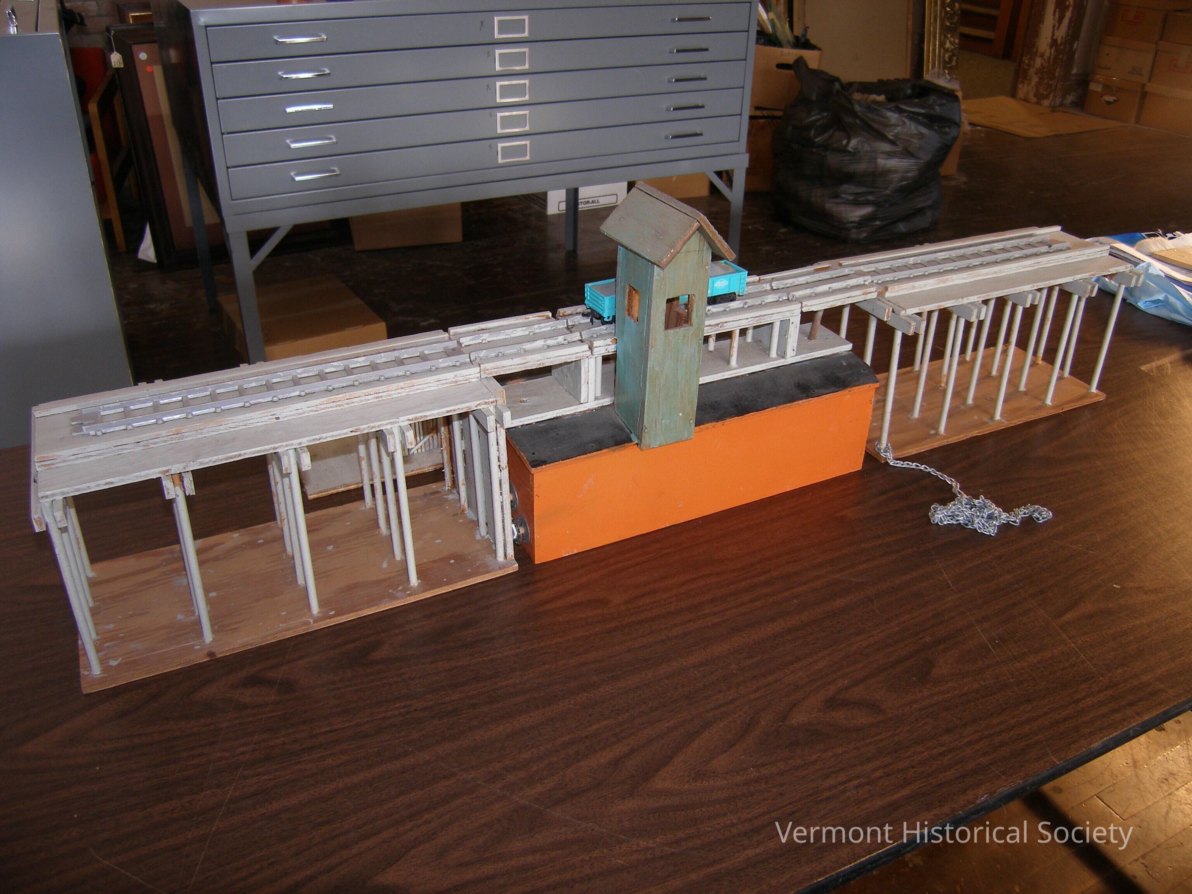 Model of floating railroad bridge across Lake Champlain connecting Vermont and New York from Larrabee's Point to Ticonderoga. The bridge was composed of stationery piers from each shore joined by a floating barge hinged on one side. Powered by a steam engine. The barge would swing open for boats to pass through.Acquisition