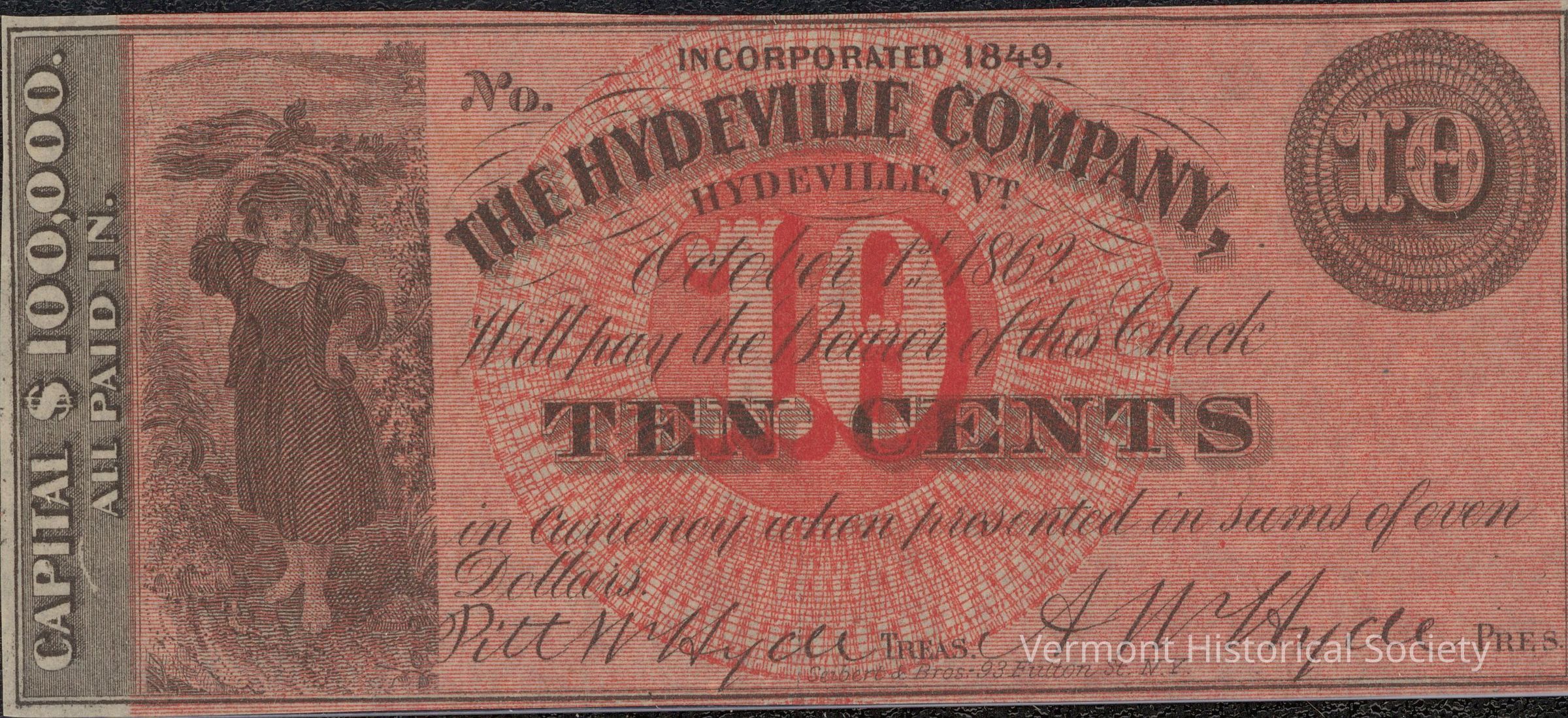 Scrip for 10 cents from The Hydeville company. The ground is printed in horizontal red stripes with a large 10 within concentric circles at the center. The words, "CAPITAL $100,000. ALL PAID IN." are oriented vertically on the left edge beside a picture of woman holding a bushel of wheat on her head. It has the inscription, "No. INCORPORATED 1849. / THE HYDEVILLE COMPANY, HYDEVILLE, VT / October 1st, 1862 Will pay the Bearer of this Check TWENTY FIVE CENTS in currency when presented in sums of even Dollars. [Pitt W. Hyde] Treas. [A. W. Hyde] Pres."