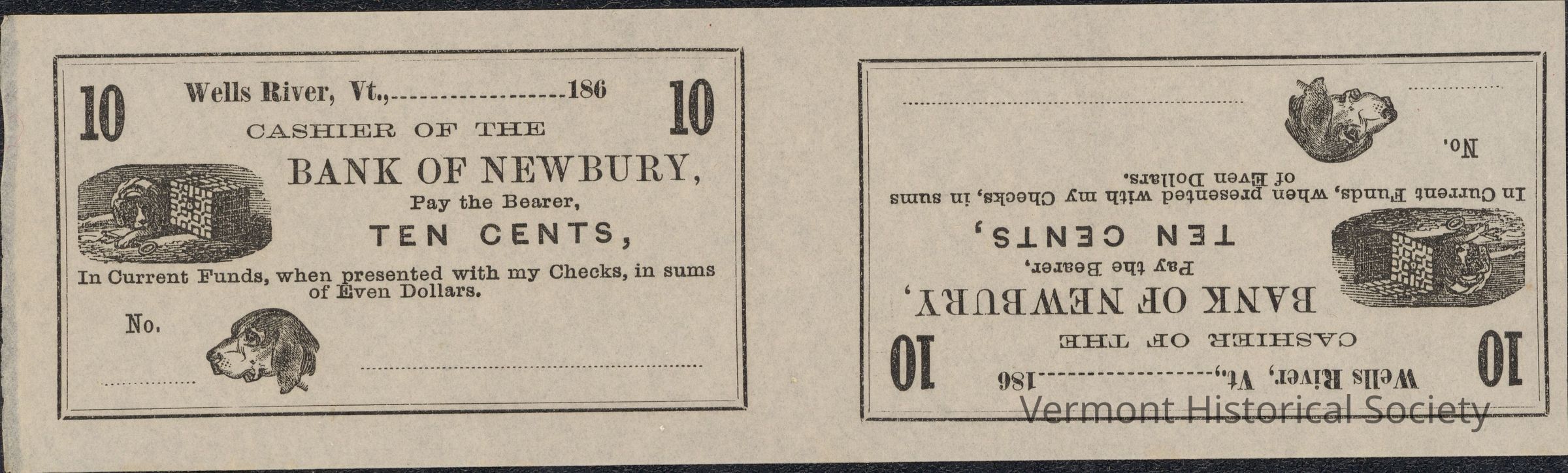 2 uncut private for 10 dollars each from the Bank of Newbury in Wells River, Vermont. They are unfilled and unsigned. They each bear 2 illustrations of dogs.