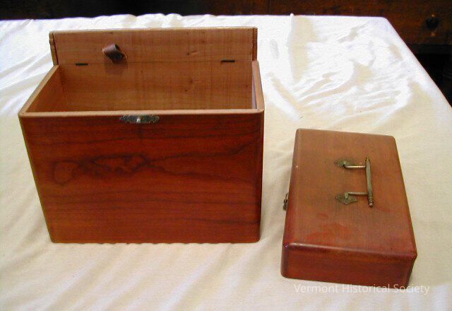 Wooden document box with hinged lid (detached). The corners of the box have been rounded. The lid has a bar handle in the center, and secures at the center front with a small, silver-toned metal latch.