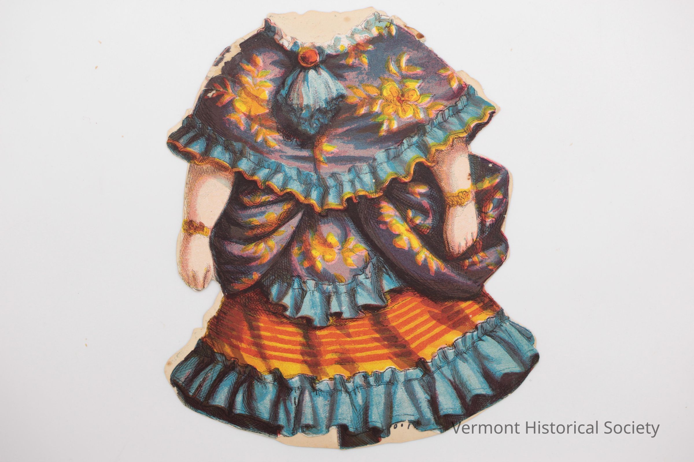Two-sided paper doll dress. The dress has a triangular cape or shawl that matches the bustle (both purple trimmed in blue with yellow flowers), and a red and yellow striped skirt with a blue ruffle. The back shows that the bustle is tied with a pink ribbon.Acquisition