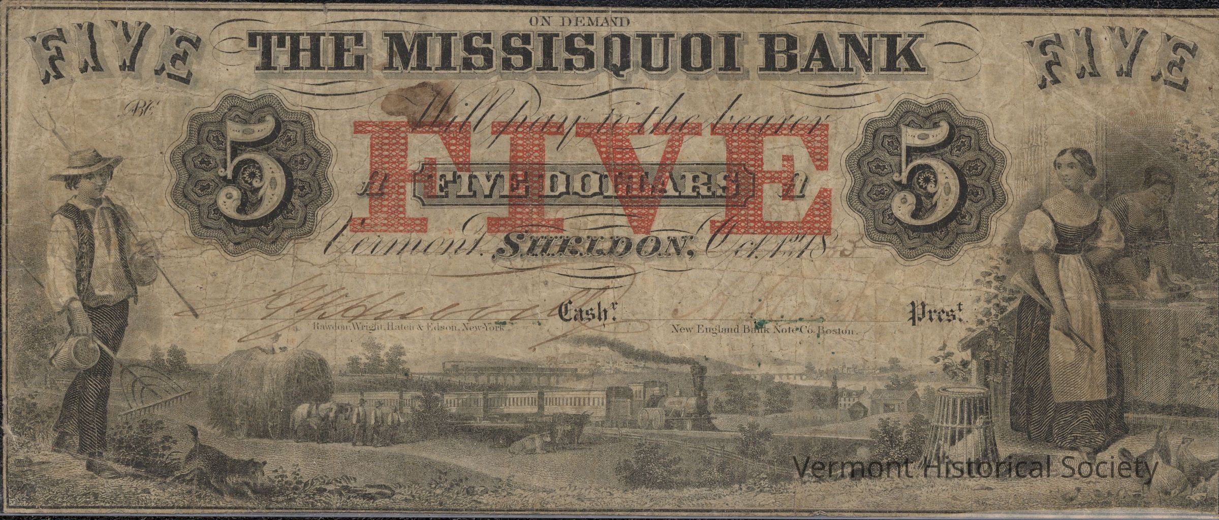 Private bank note for 5 dollars from The Missisquoi Bank in Sheldon, Vermont. It is dated Oct. 1st, 1863. It is signed by H. G. Hubbell (cashier) and H. E. Hubbell (president).