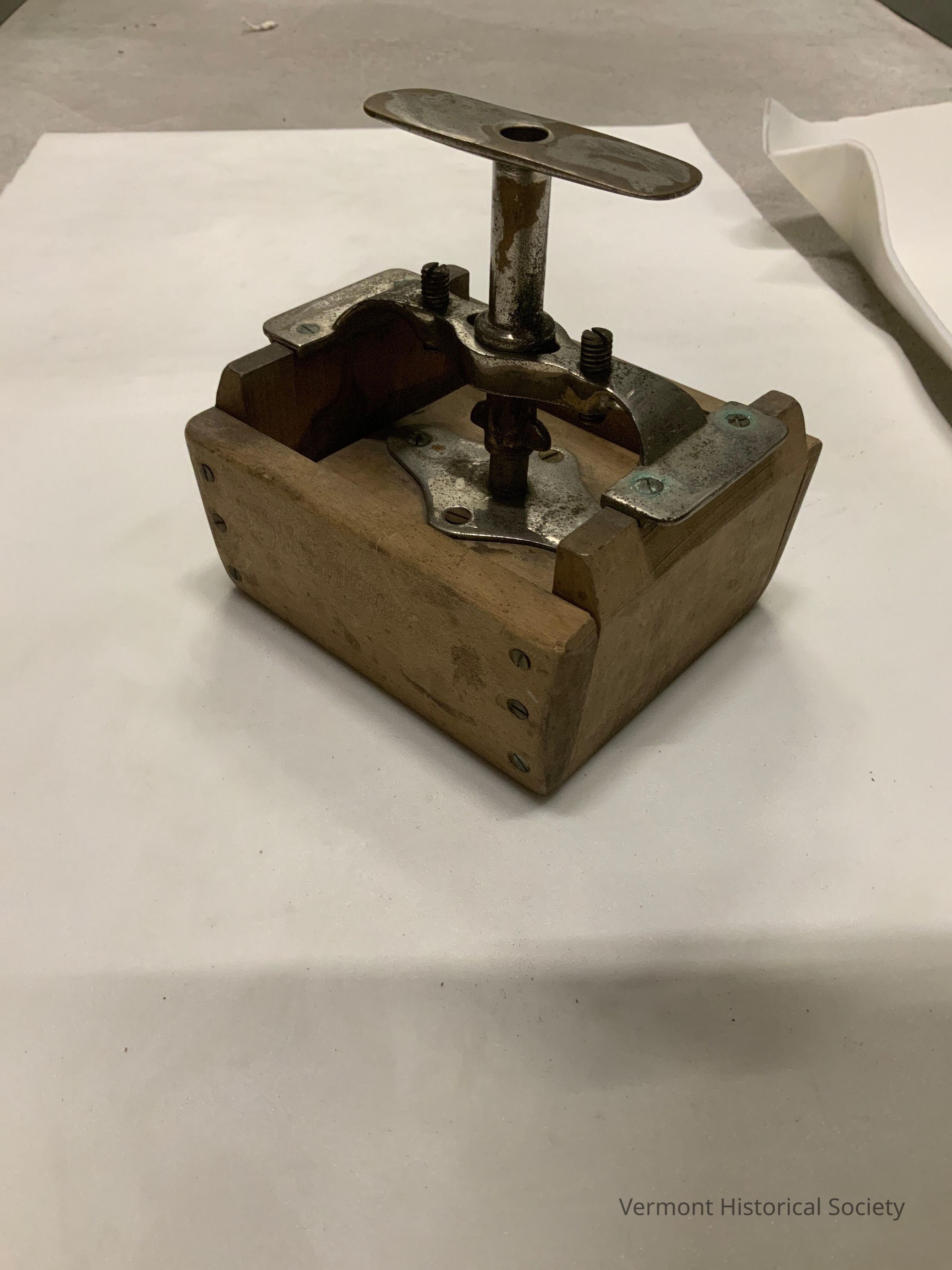 Wooden and steel butter mold. The mold has four straight sides fastened together with screws and a top press plate. Two sides are lengthier and shorter in height. The other two sides are taller with a beveled outer top edge.A steel manual press is screwed to the top edges of the shorter sides and through a steel plate into the central flat press. The underside of the central press has molded grooves carved into it to create a large check pattern in the butter.