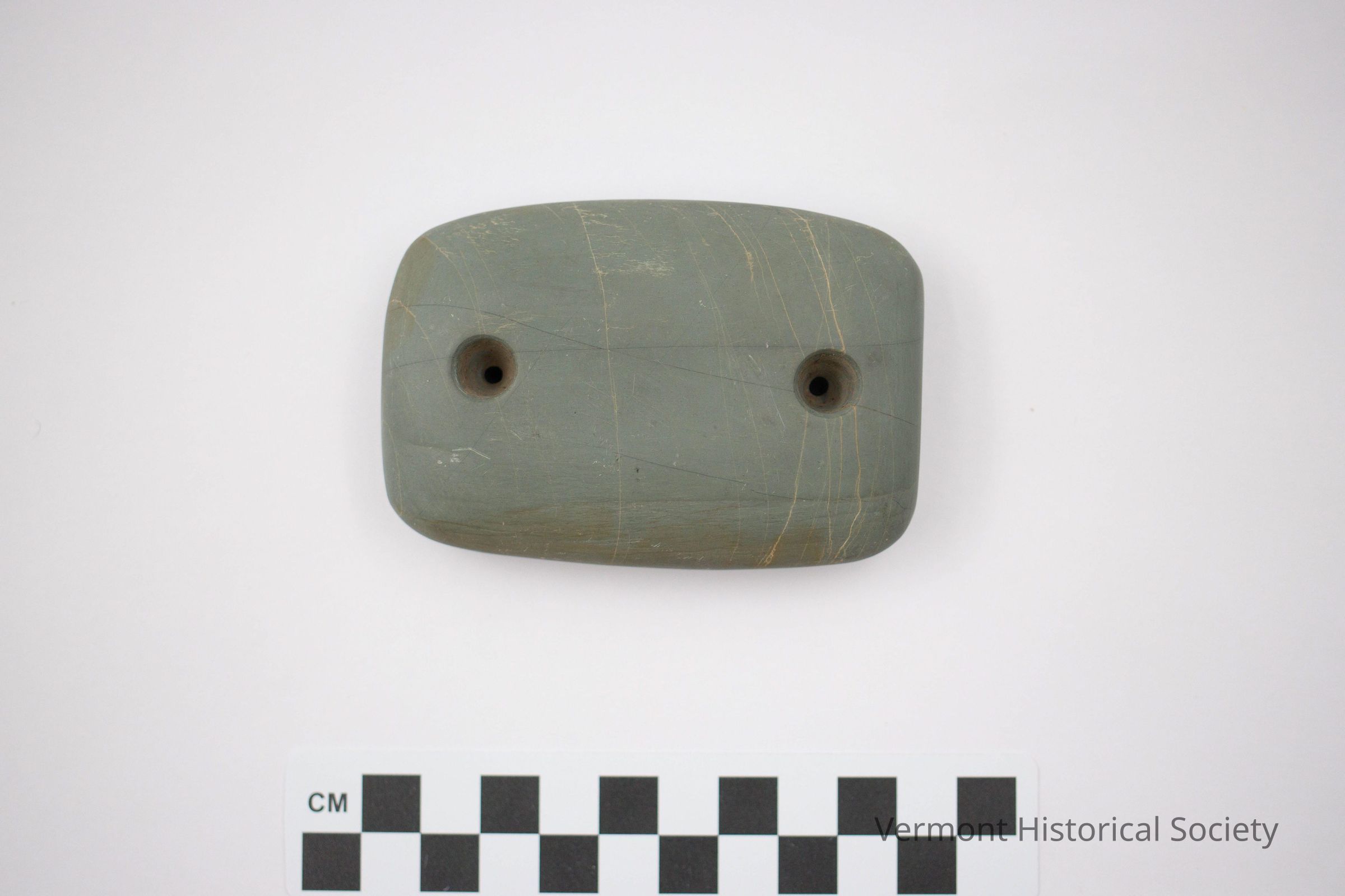 Rectangular, ground and polished slate pendant. It has holes drilled from both sides. There are no signs of wear. The beads have been strung onto a monofilament string (modern).