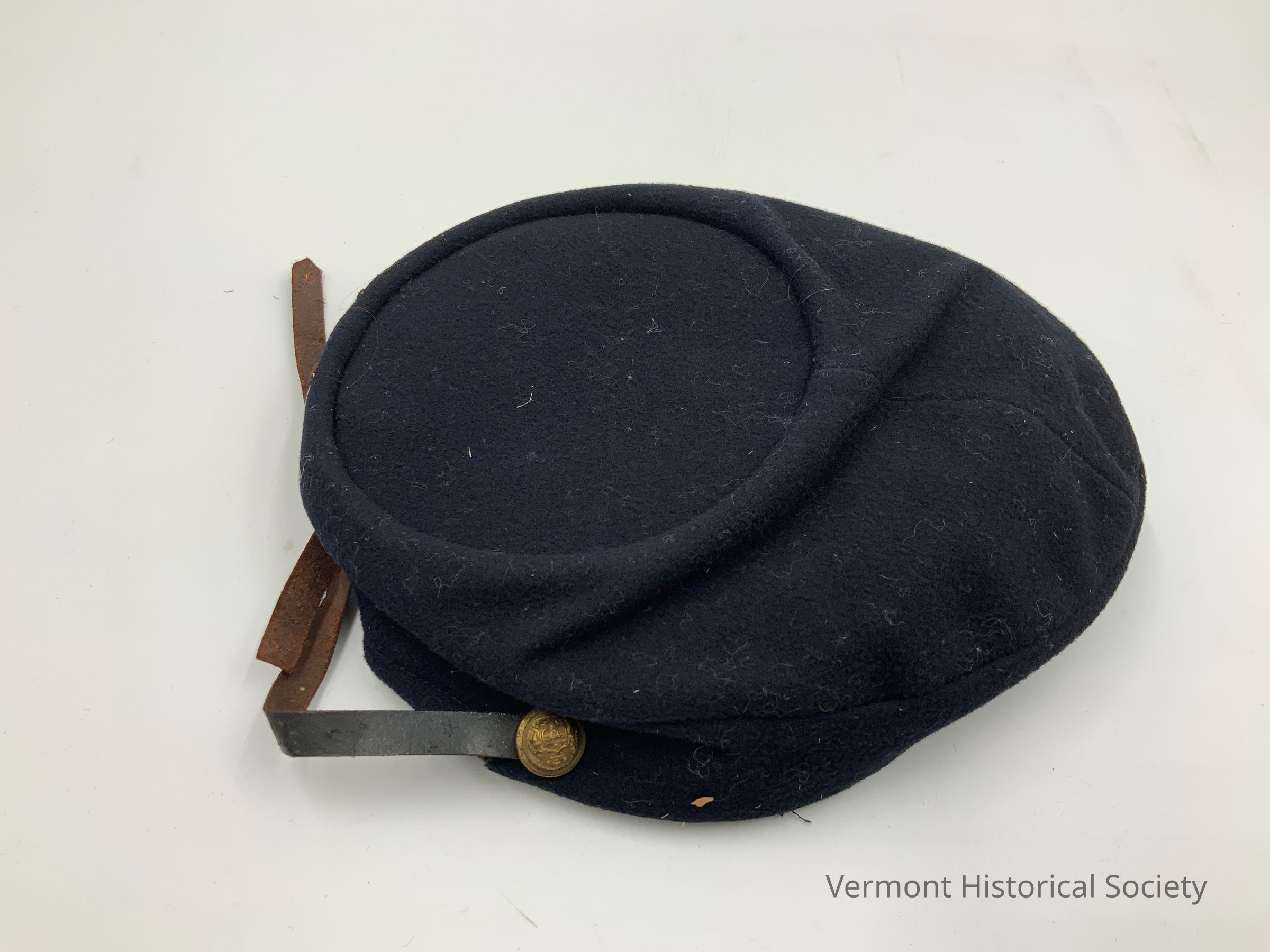 Blue wool forage cap with missing brim. The crown has a stiff, flat top and unstiffened sides, allowing the top to fall forward. There is a brass button on either side of the crown, with a black and brown leather strap running between them. The initials "U.W." are embroidered inside a laurel wreath at the front of the cap. The interior is lined with black silk and printed with the label, "GOTTSCHALK BROS. 202 & 204 West Water St. MILWAUKEE, WIS."Context