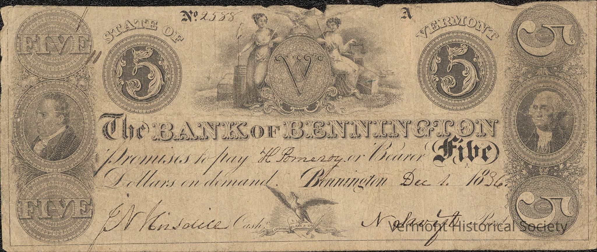 Private bank note for 5 dollars from The Bank of Bennington. It is printed with 2 bust portraits (left and right edges), and a scene of 2 women flanking a medallion with the letter V (top center). It has the inscription, "The BANK OF BENNINGTON Promises to pay [H. Pomeroy] or Bearer Five Dollars on demand. Bennington [Dec 1.] 18[36.] / [J N Hinsdill] Cashr [N Swift] Prest."Context