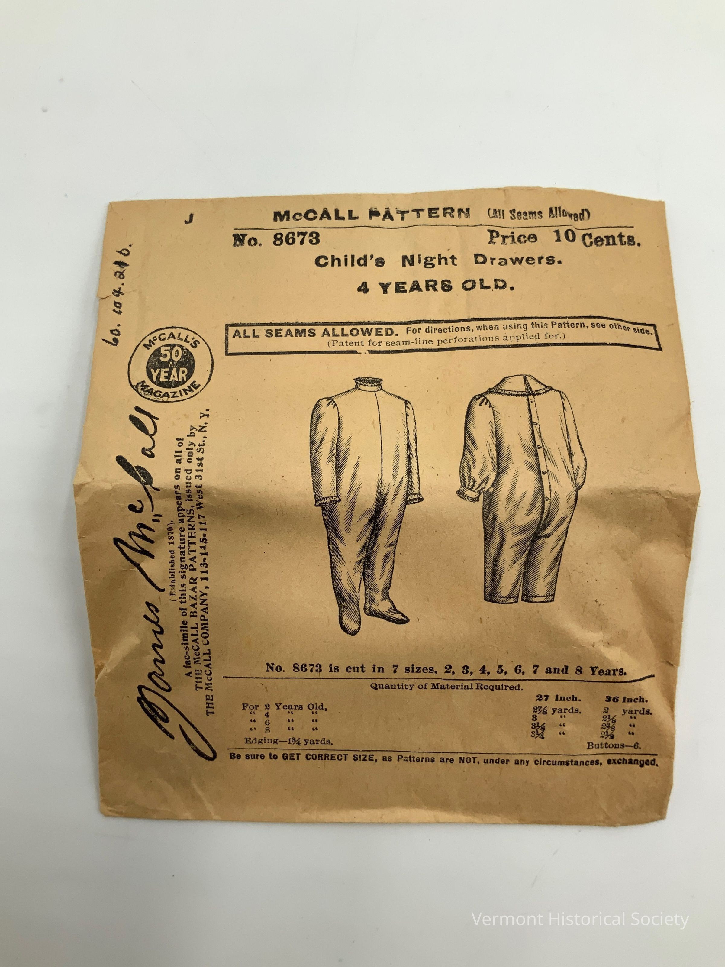 Cut tissue paper sewing pattern in a commercial envelope. The front of the envelope is printed with brand information ("McCALL PATTERN"), sewing instructions, and an illustration of the finished garment. The garment is children's pajamas with variations for the collar, sleeve fullness, and pant length ("Child's Night Drawers").Context