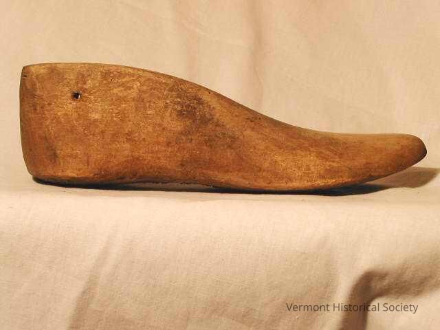Full-foot shoe last. The last is formed from a single piece of wood. There is a hole at the upper heel for hanging.