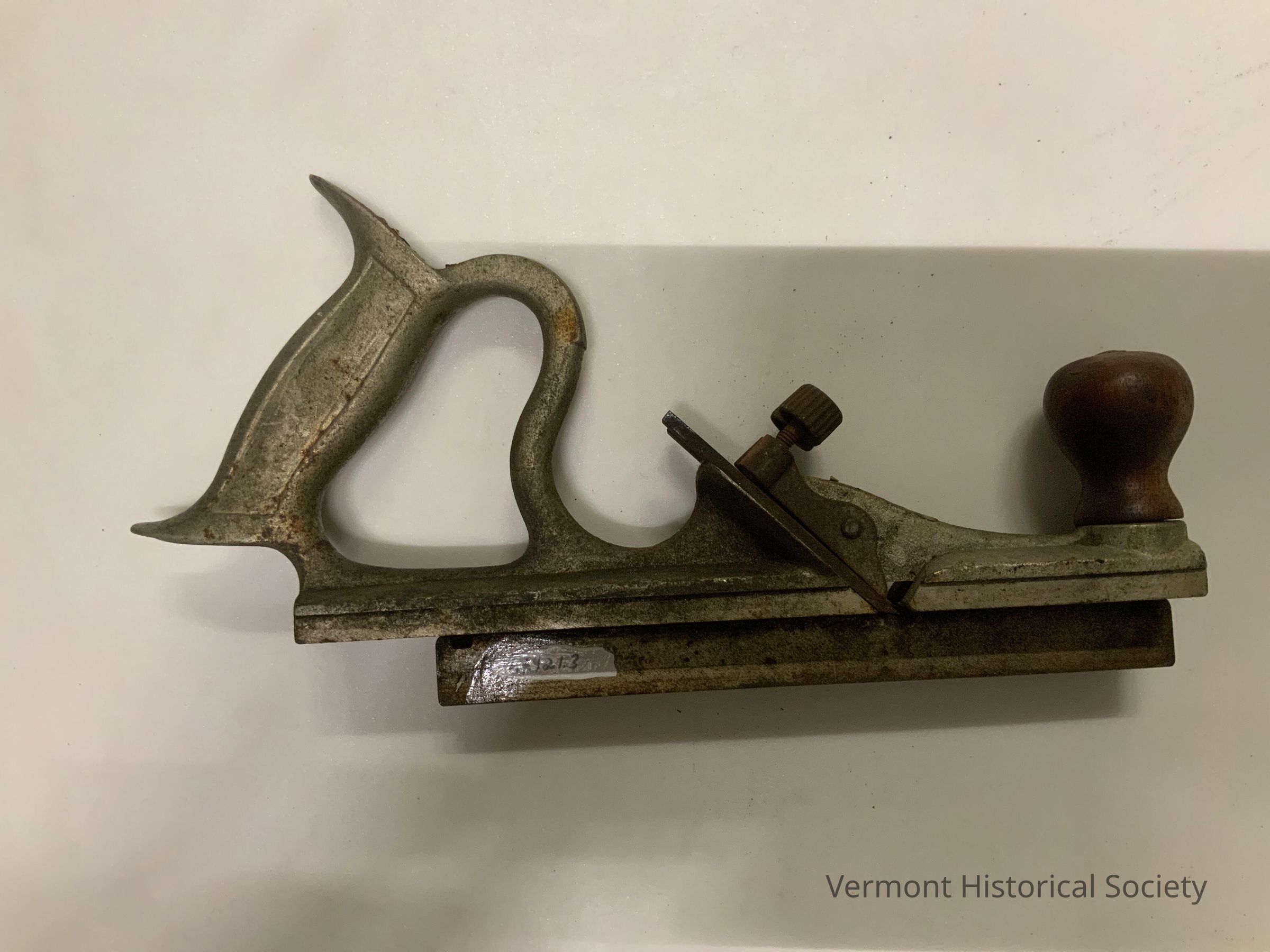 Metal plane with a tall handle, similar in style to a saw handle. There is a turned wooden knob at the front of the plane.