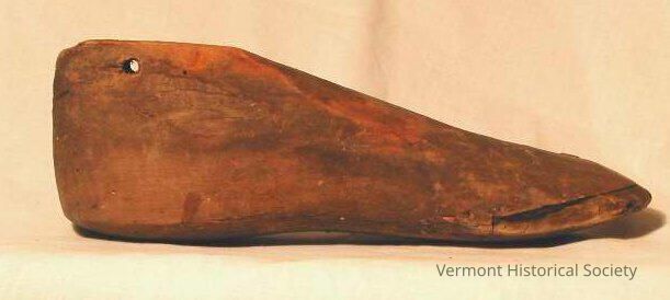 Full-foot shoe last. The last is formed from a single piece of wood. There is a hole at the upper heel for hanging. There is a large gouge at the toe.