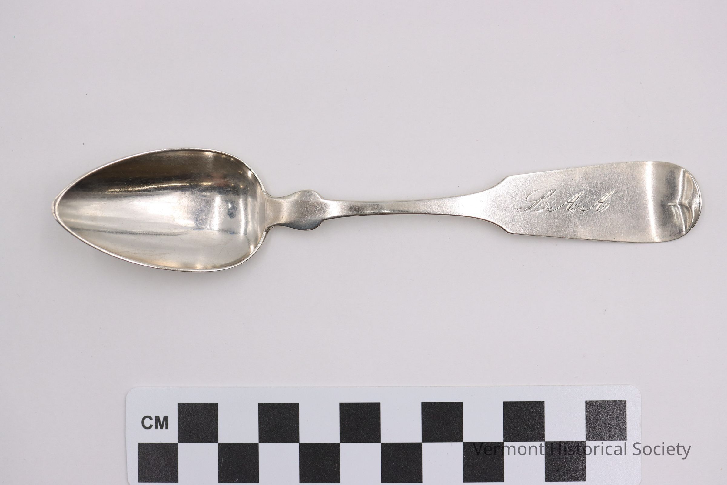 Silver teaspoon with pointed shoulder and upturned tipped fiddle handle. The handle is engraved with the initials "L.A.A." The back of the handle is marked, "B.M.BAILEY."