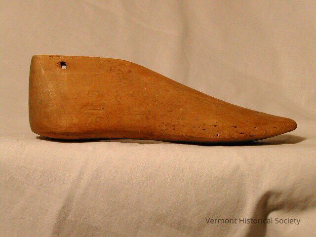 Full-foot shoe last. The last is formed from a single piece of wood. There is a hole at the upper heel for hanging.