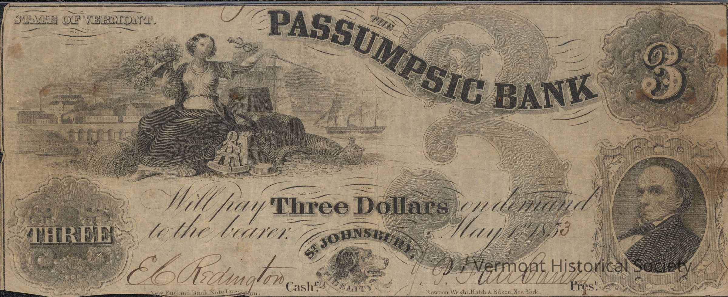 Private bank note for 3 dollars from The Passumpsic Bank in St. Johnsbury, Vermont. It is dated May 1st, 1853, and signed by E. C. Redington (cashier) and J. P. Fairbanks (president).
