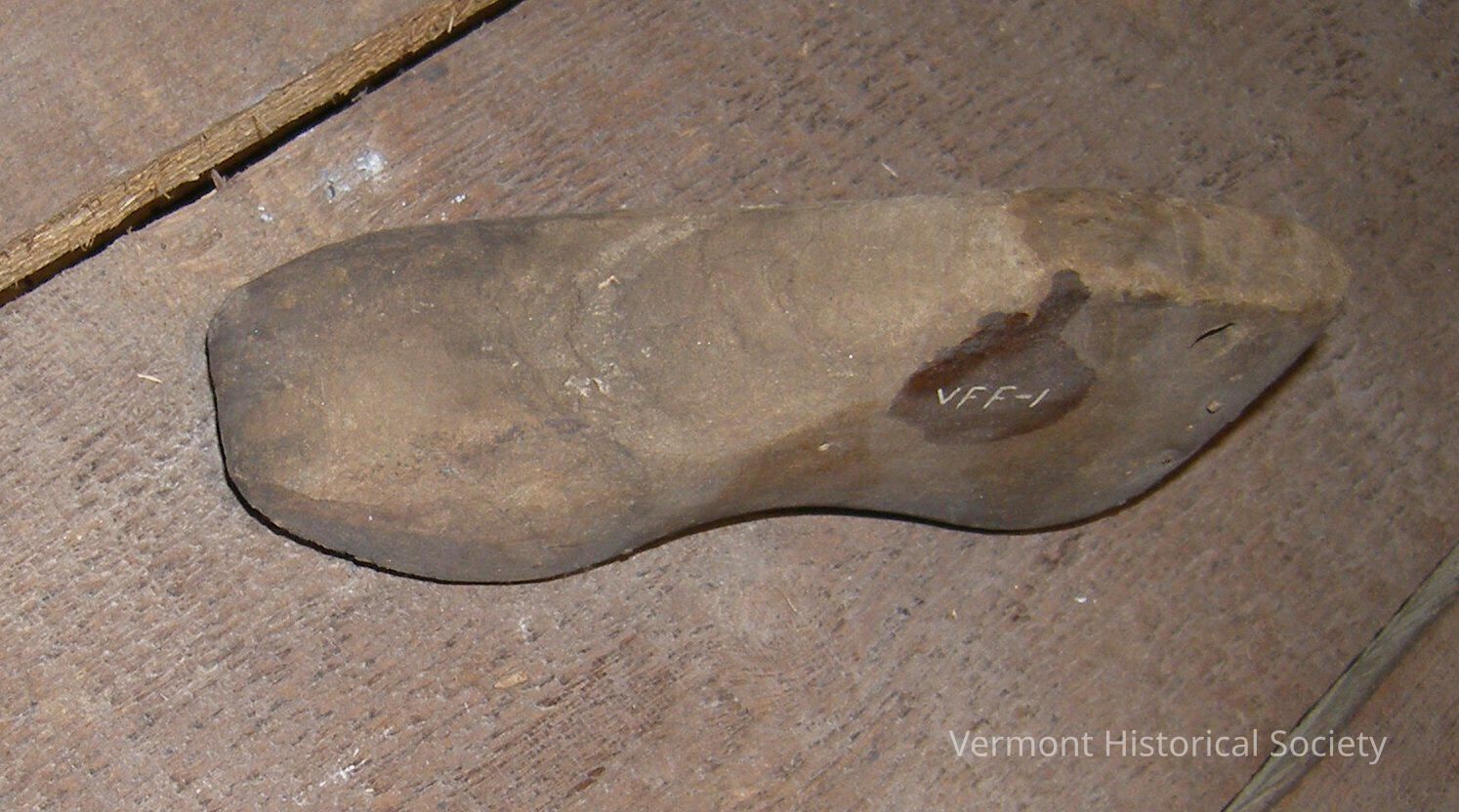 Full-foot shoe last. The last is formed from a single piece of wood. The top of the foot is carved with a round ridge for forming slippers. There is a hole at the upper heel for hanging.