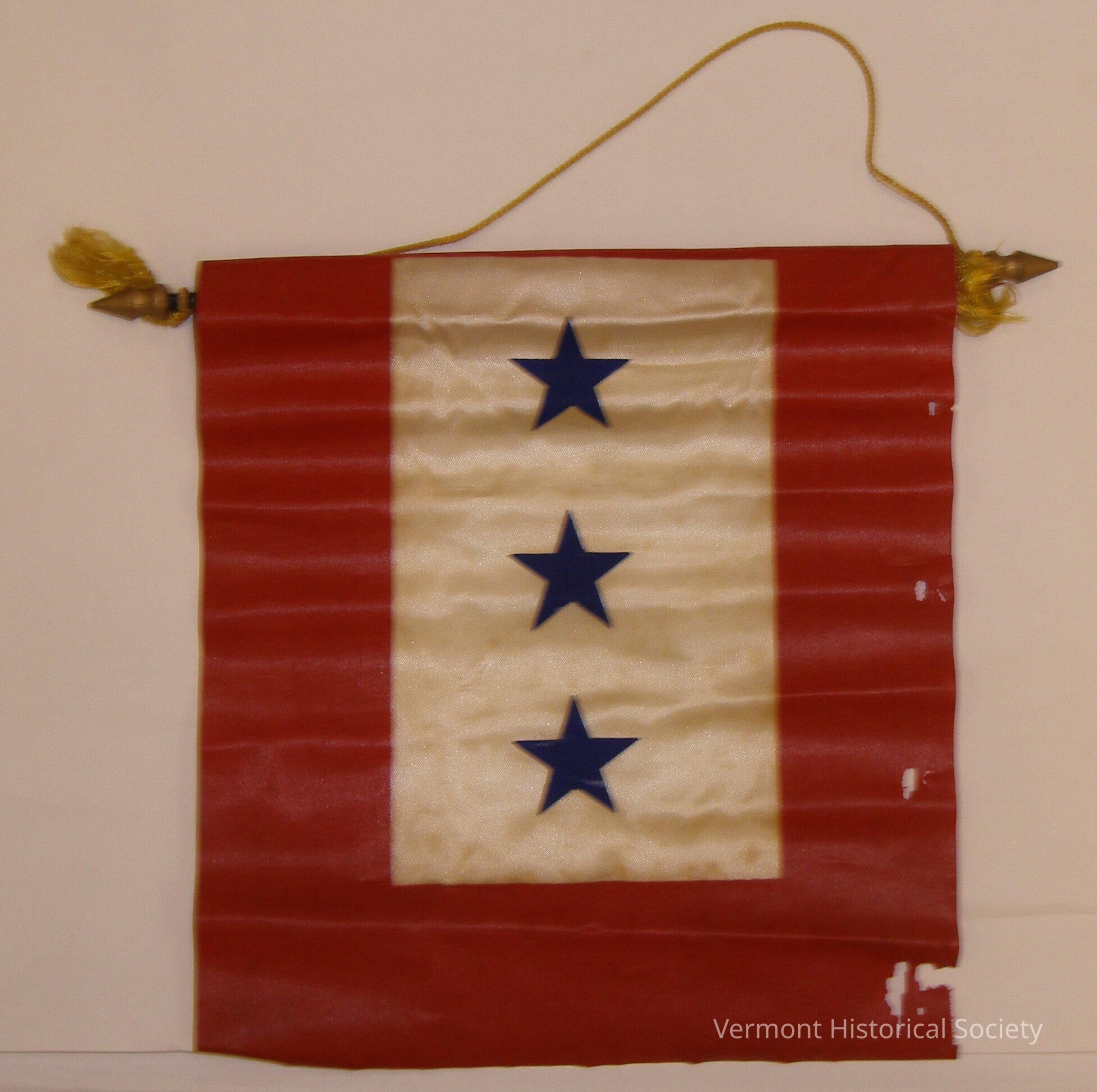 Small red-and-white flag with three blue stars down the center. The flag is made of a white satin-woven synthetic fabric; both the red and blue elements are a thick plastic-like substance applied to the surface of the fabric. The top edge has been folded over and there is a dowel through it. There is a synthetic gold cord applied to either end of the dowel to hang it by. Each end of the dowel is capped with a small, gold-toned plastic spear tip.Context