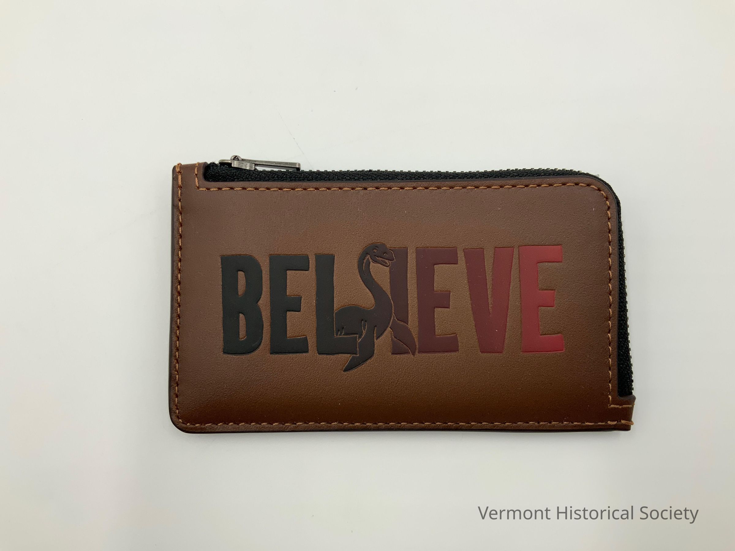 Small, rectangular leather wallet stamped with the word "BELIEVE" and an image of a water dinosaur [Champ]. The wallet has an interior pouch accessed by a zipper along two sides. The back has 4 slots for holding cards. The slots are made from red leather.