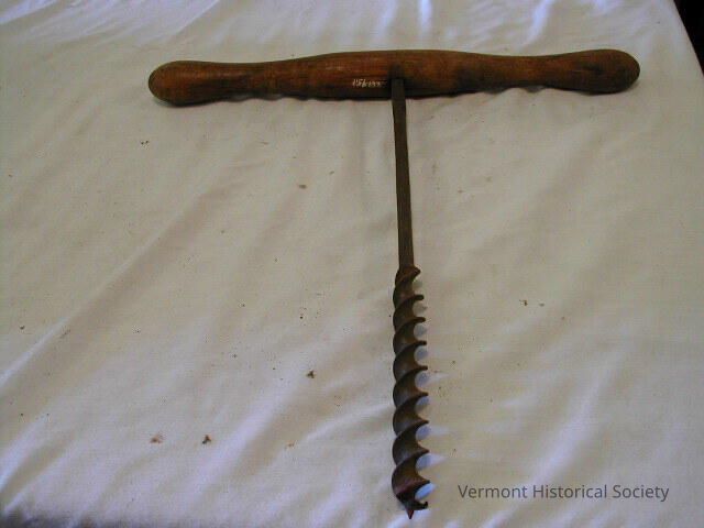Spiral auger. The auger is made of a turned wooden t-handle with rounded ends and three etched lines in the middle that line up with the tang of the auger's metal piece. The metal piece is a rounded shaft with spiral flighting starting from the middle and a feed screw at the tip. The metal is rusted and has no additional coloring on the handle or on the metal auger piece.