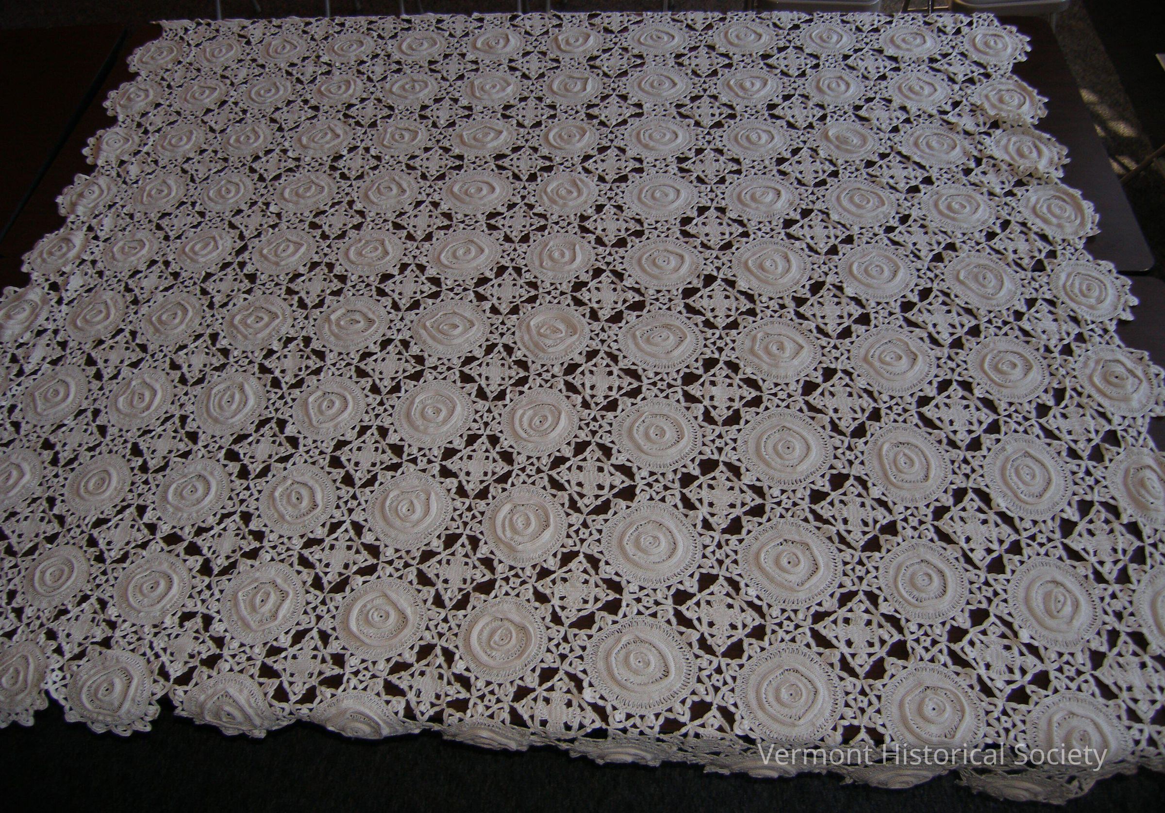 Crocheted double bed size spread that is made up of individual medallions (12 medallions long by 11 medallions wide). The center part of the medallion is round and made up of several rows of double and single crochet, including two sections that are 3 dimensional. The center portions vary somewhat but are all about 5.5" in diameter. The outer 'petal' portion or rows are where the medallions attach to each other and to the diamond shaped motifs that fill in the shoulder area.Context