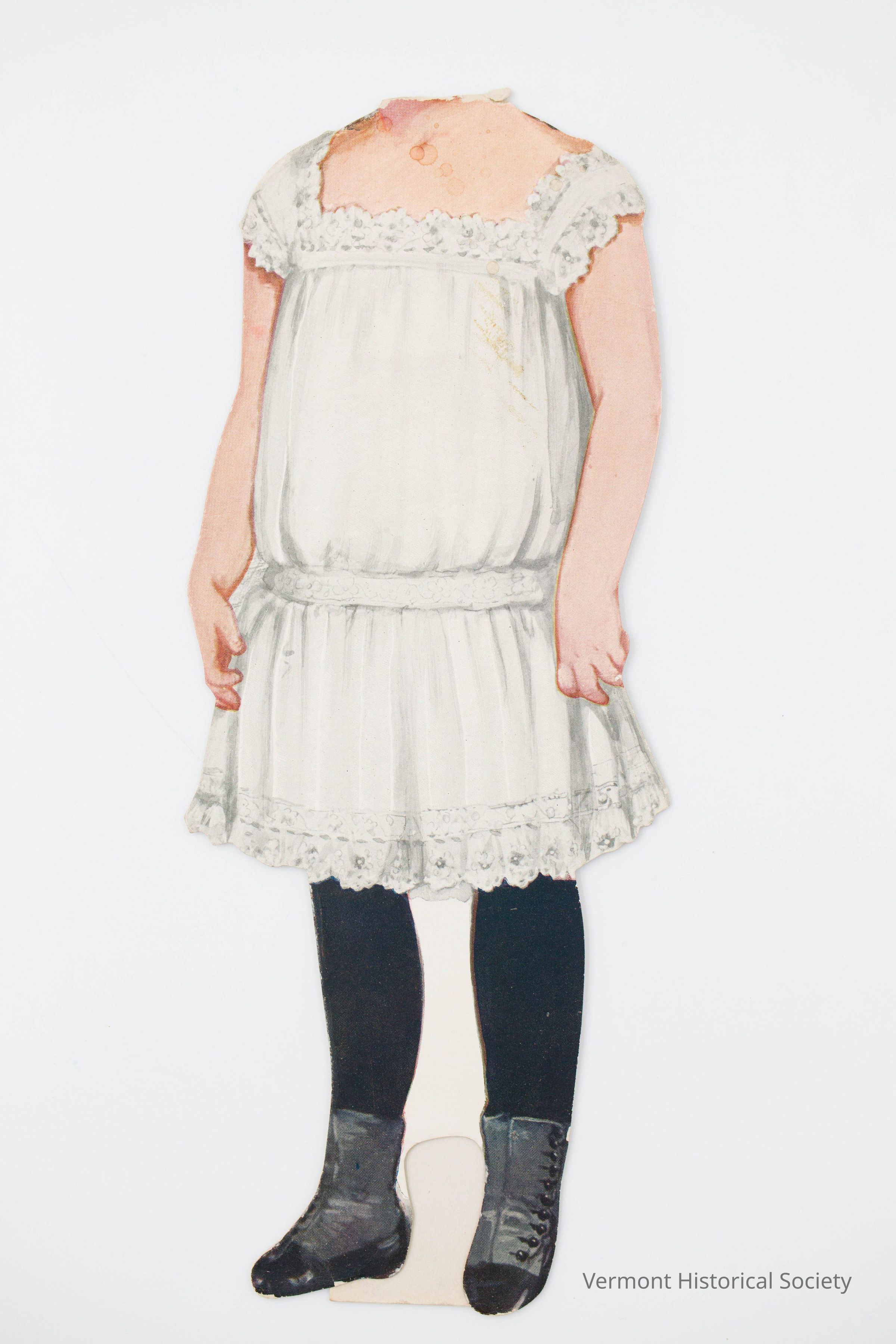 Large, paperboard doll with no head and a foldout standee. The doll is wearing white undergarments consisting of a drop-waist chemise and black stockings. She is also wearing black boots. The back is printed with the label, "DOLLY DARLING no. 3".Context