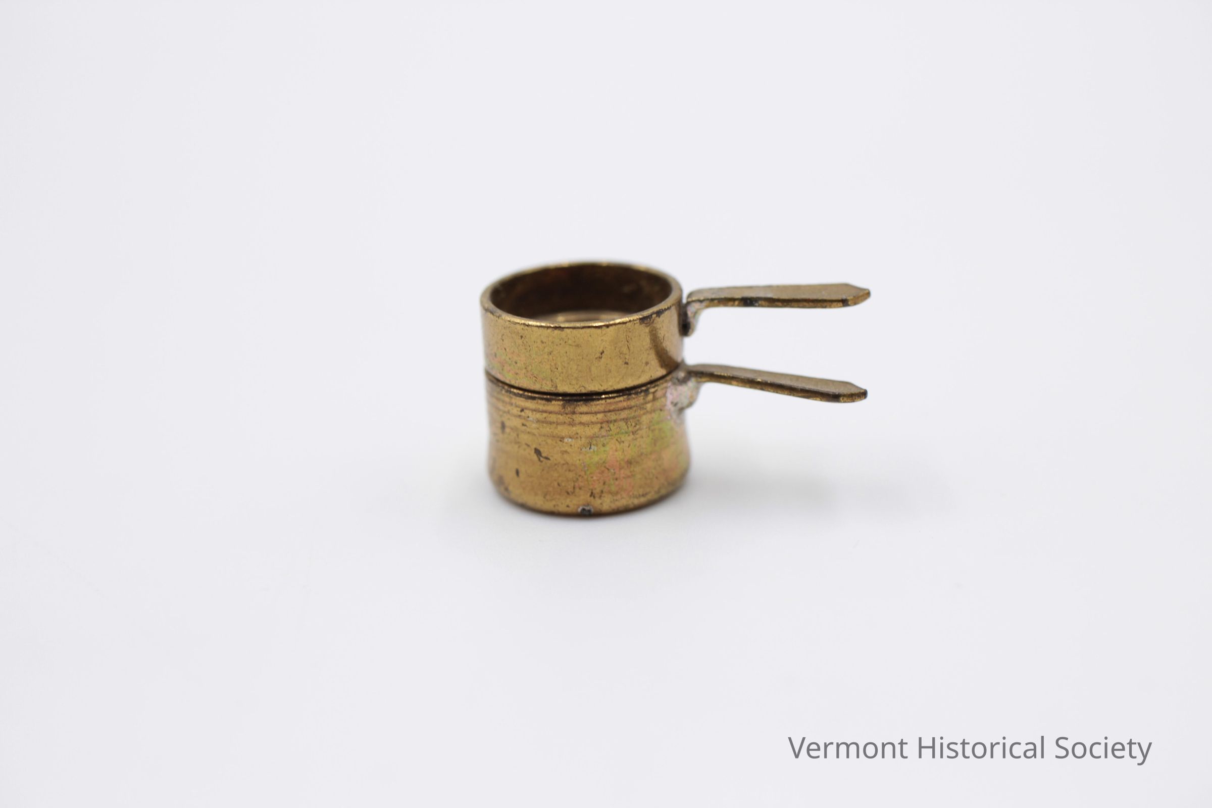 Miniature brass double boiler consisting of two pots. One pot nests into the top of the other.Context