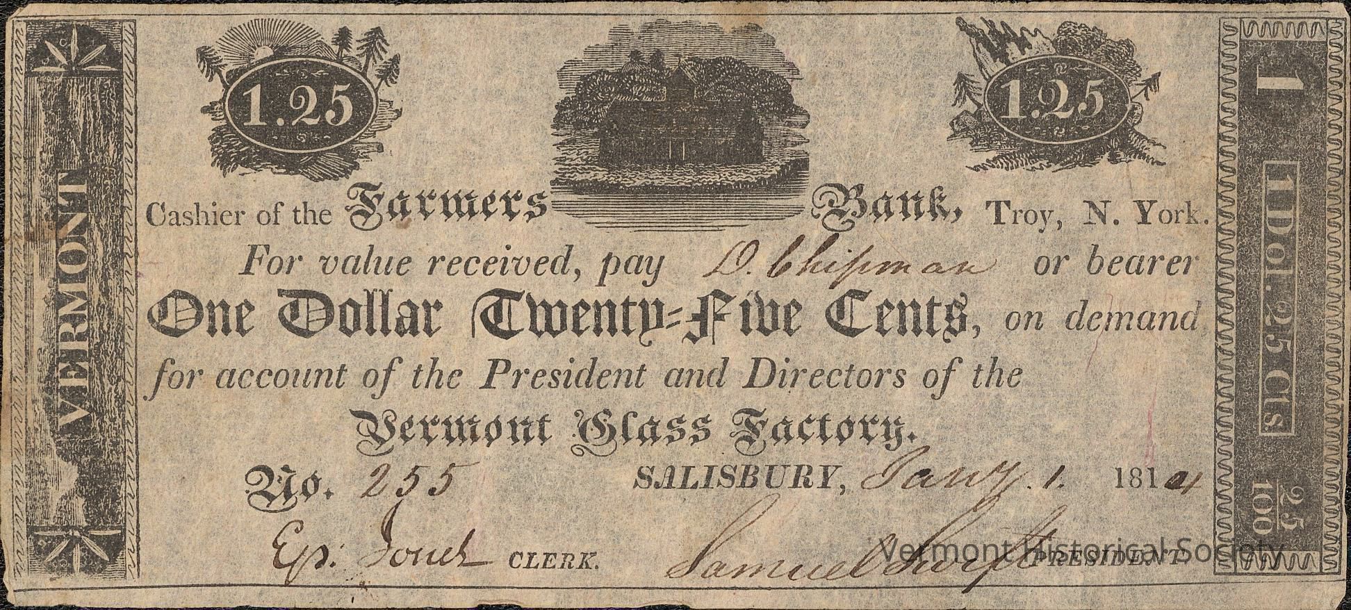 Private bank note for 1 dollar and 25 cents issued by Farmers Bank on behalf of the Vermont Glass Factory. It is printed with the inscription, "Cashier of the Farmers Bank, Troy, N. York. For value received, pay [D. Chipman] or bearer One Dollar Twenty=Five Cents, on demand for account of the President and Directors of the Vermont Glass Factory. No. [255] SALISBURY, [Jany. 1.] 181[4] [Ep: Jones] CLERK. [Samuel Swift] PRESIDENT."